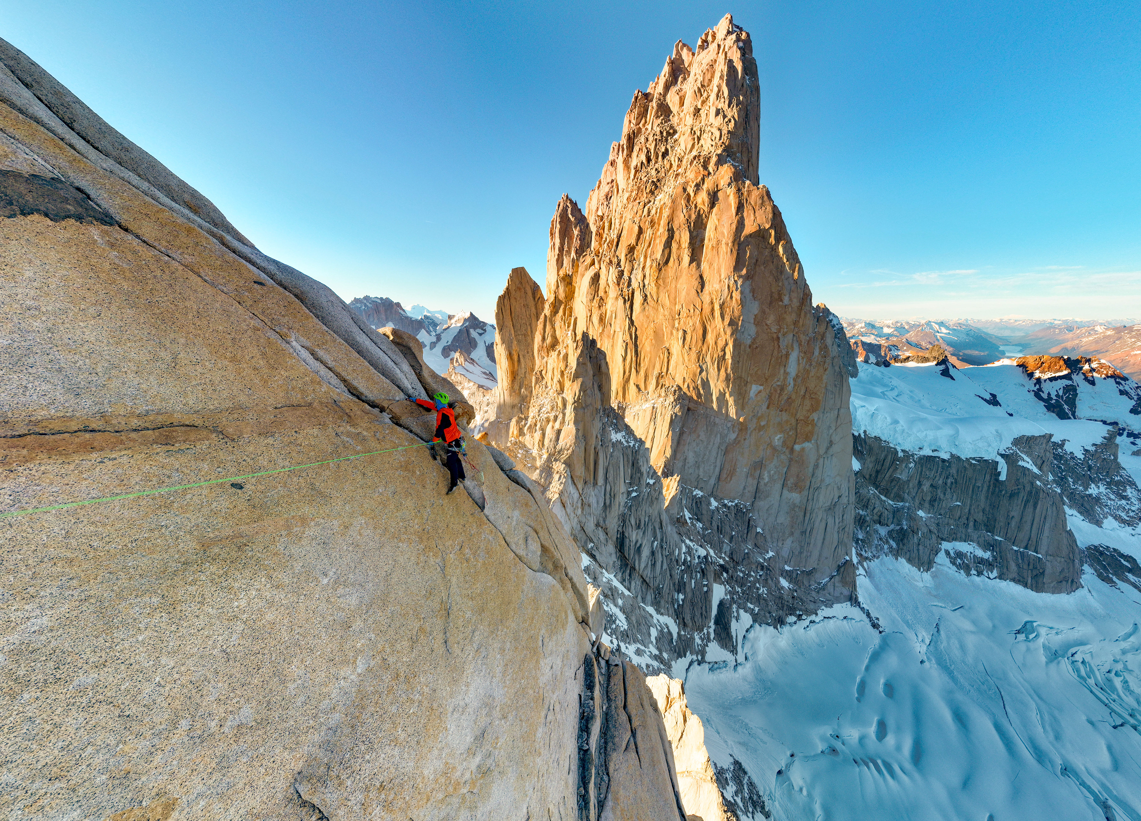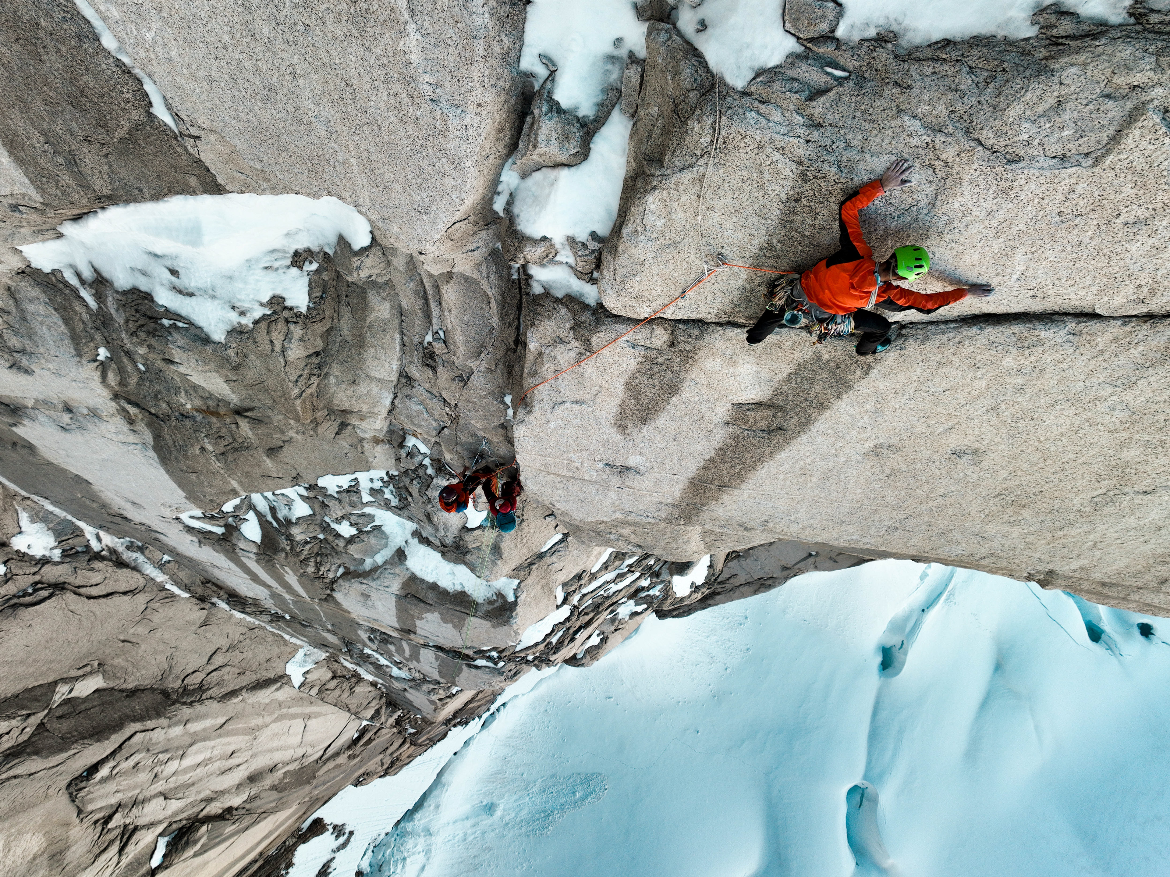 Encara Pol la última sección, unas placas hermosas, tumbadas, con agua y nieve pero escalables, chapas, muchas chapas. La escalada de estas se veía de calidad, líneas muy estéticas que combinaban las placas con la arista, todo esto en un entorno increíble a 500 metros sobre el glaciar. En el último largo de 20mts la roca se pone mala, muchos bloques sueltos, así que hay que tener cuidado ahí.