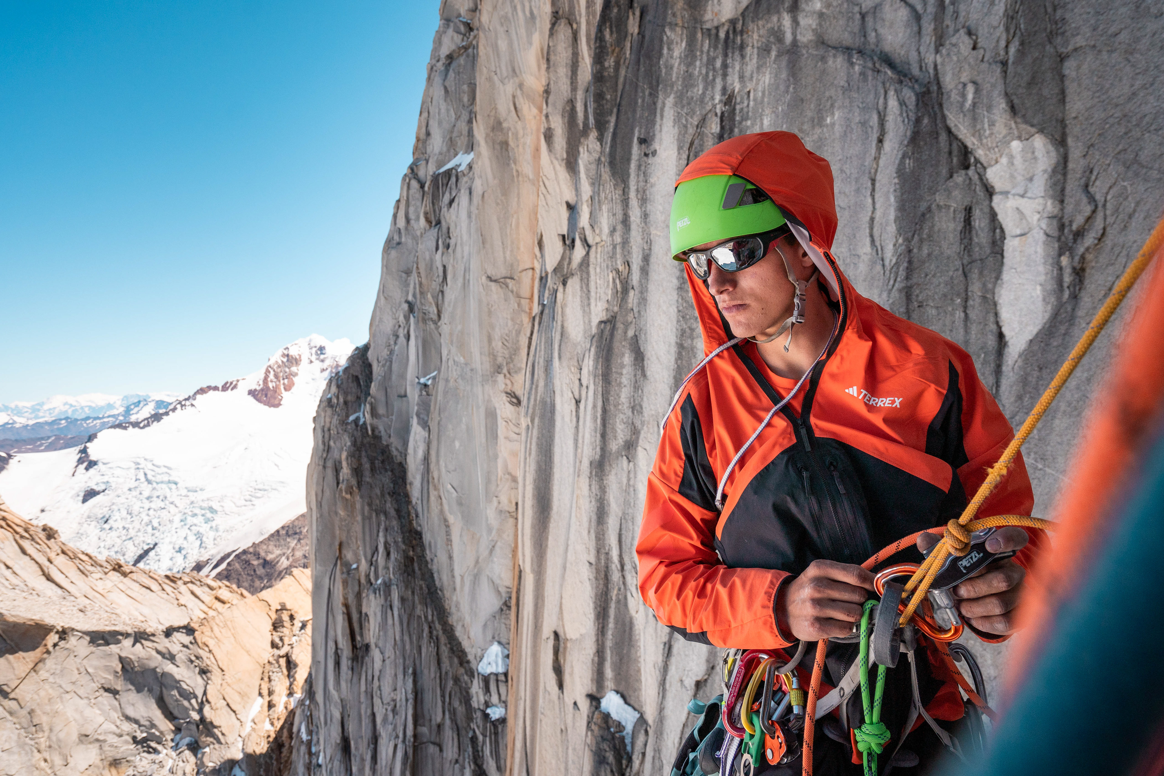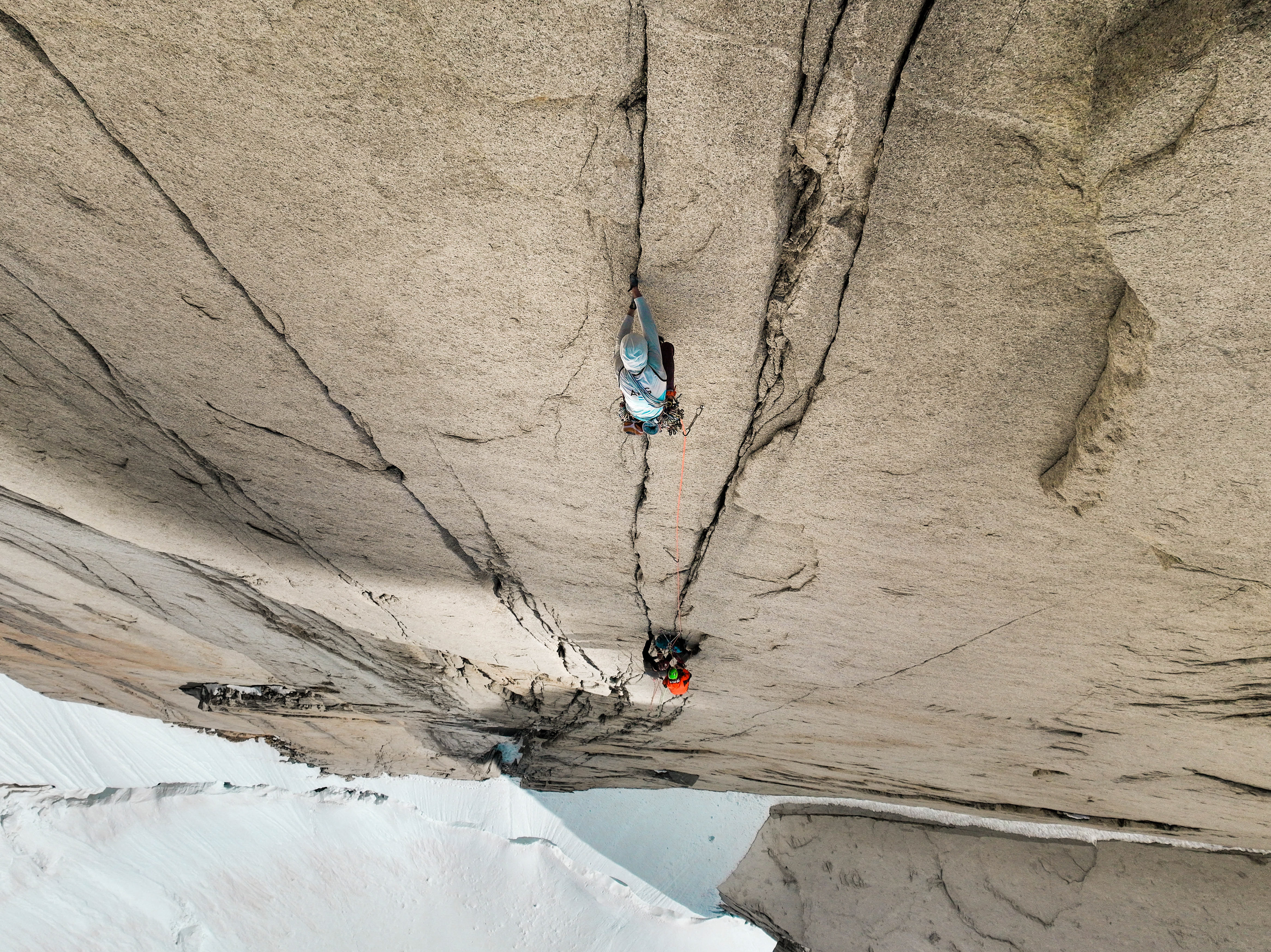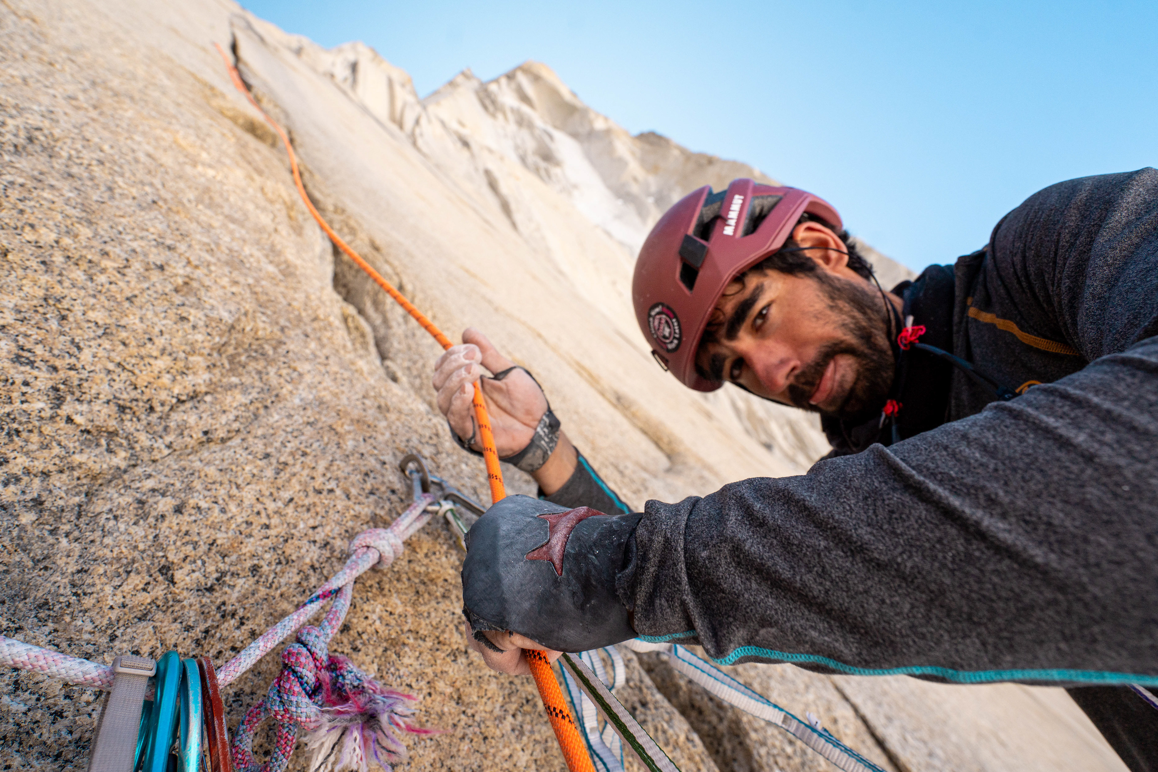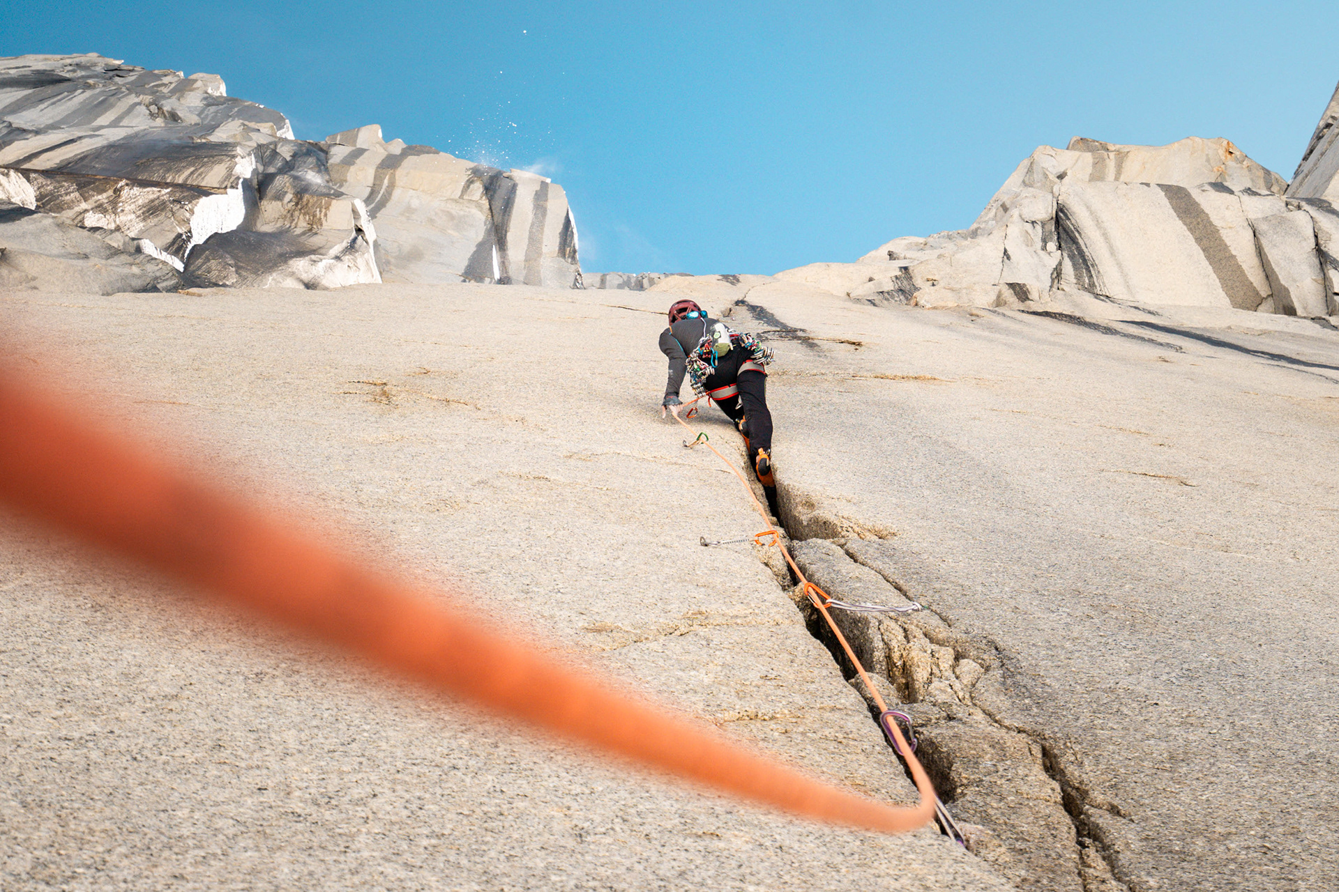 A las 7:00 estábamos en el pie de vía, 500 metros de pared vertical con muchas fisuras sobre nosotros: un sueño. La primer sección me tocaba a mí, 6 largos entre 6b y 7a+, pude liberar todos los largos a vista excepto por uno, un 7a+ (para mí puede ser 7b tranquilamente) con un paso de placa para pasar de un sistema de fisuras a otro. En el pegue a vista se me rompió una toma del crux, como la idea era liberarla, probé un poco el paso y bajé para darle otro pegue, segundo pegue pasé el crux y 10 metros más arriba ya en una sección fácil, se me patinó un pie; sentí mucha bronca y estuve pensando un rato si dar otro pegue o no, cada intento es tiempo que se “pierde” en un tipo de escalada donde el tiempo es clave. Decidí darle un último pegue, pasé el crux, y continué escalando hasta la cadena, se sintió muy bien haberlo encadenado, mucha emoción y adrenalina, quedé tan motivado que le pedí a Nacho por favor si podía hacer un largo más, la manija era total. Un larguito más de 7a para terminar mi sección y quedamos al pie del 7c, hora de escalar para Nacho.