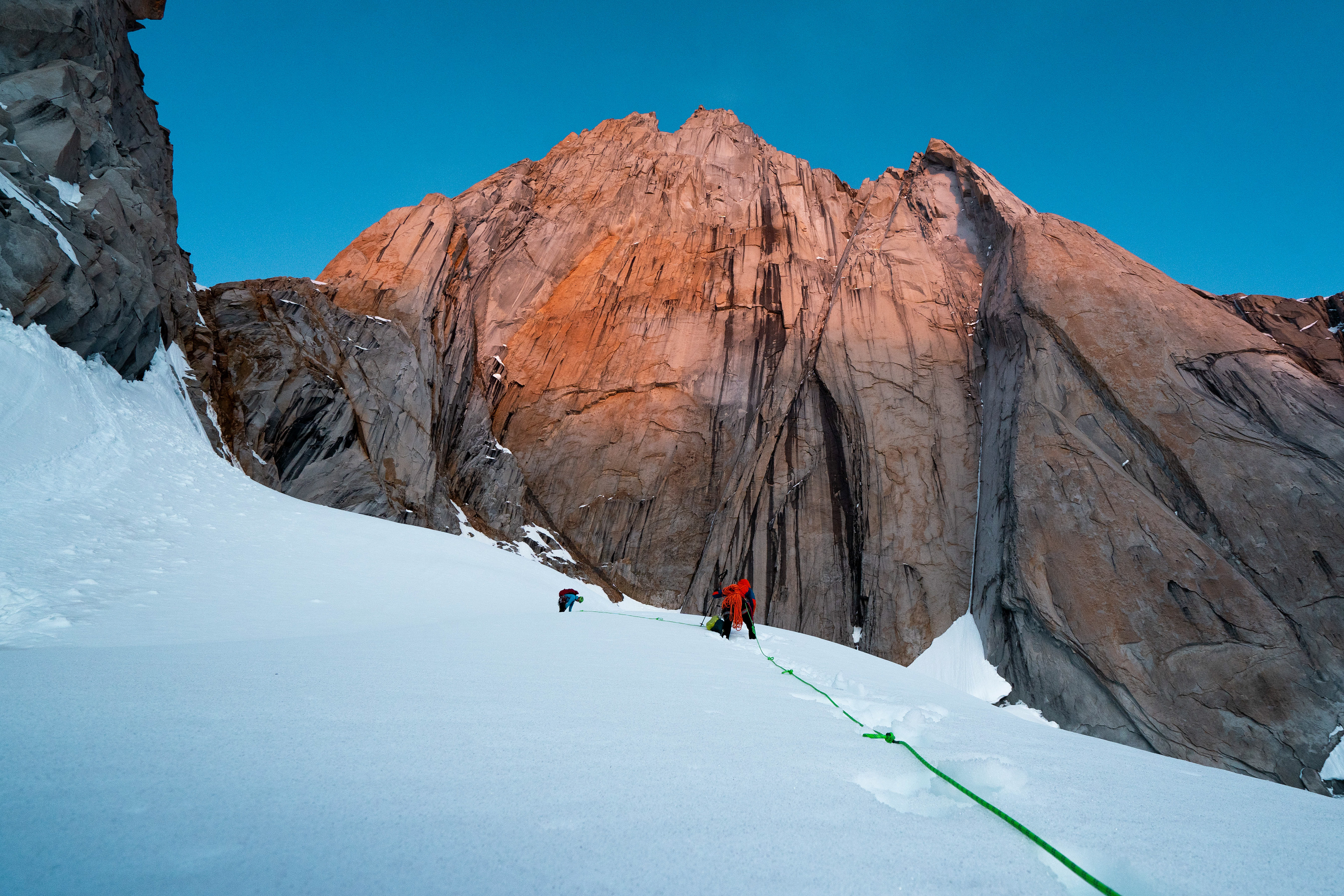 Nos despertamos a las 3:00, entre desayuno, un poco de fiaca, y preparar todo, a las 5:00 salimos para la pared, 6:30 estábamos abajo de la rimaya. Fuimos adonde vimos que estaba cruzable y se veía fácil, un puente que conectaba de lado a lado, medio finito pero bueno, era la mejor opción, encaré la rimaya y el puente aguantó, primer crux superado (la temporada pasada Nacho había intentado ir a esta vía pero no pudieron cruzar la rimaya).