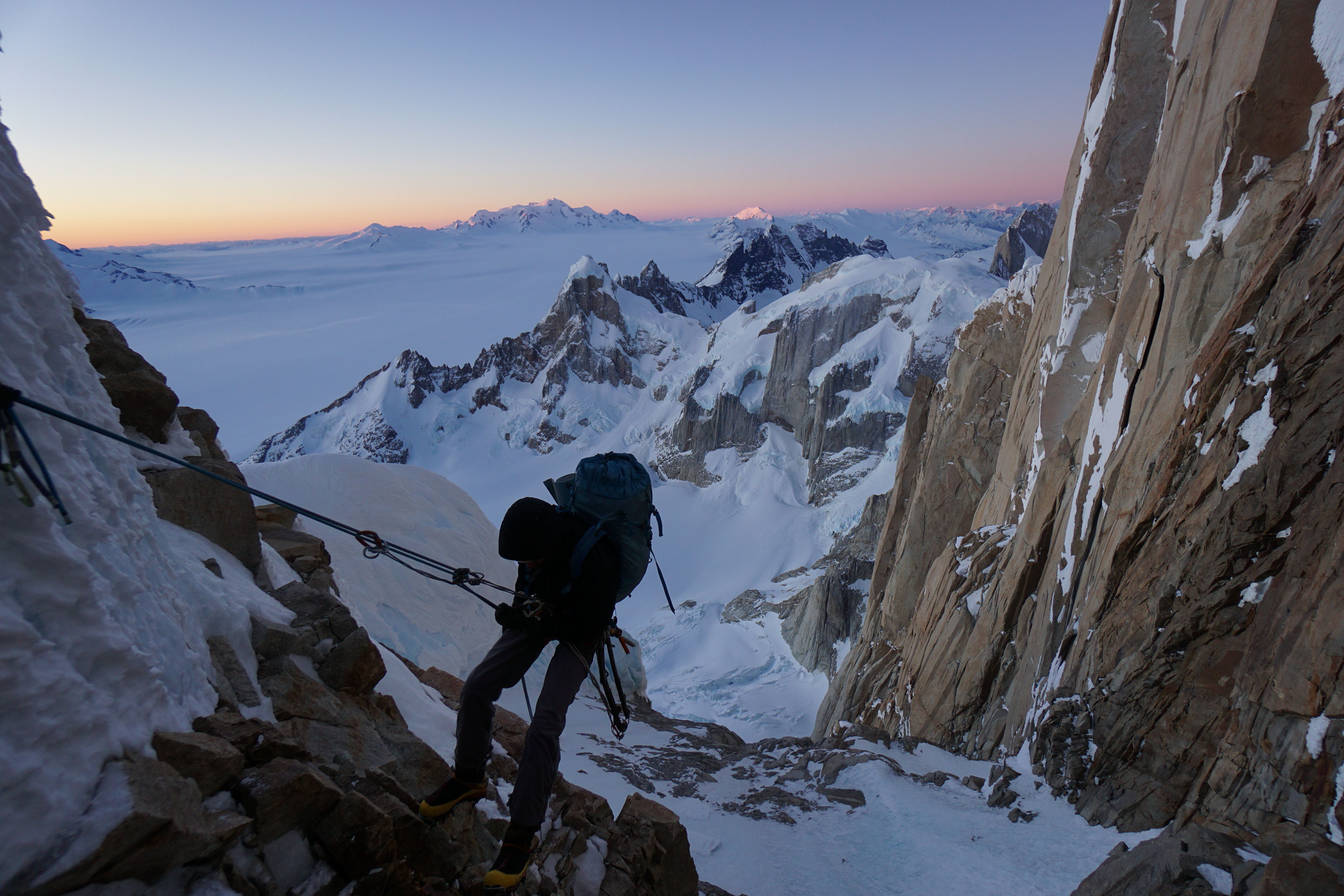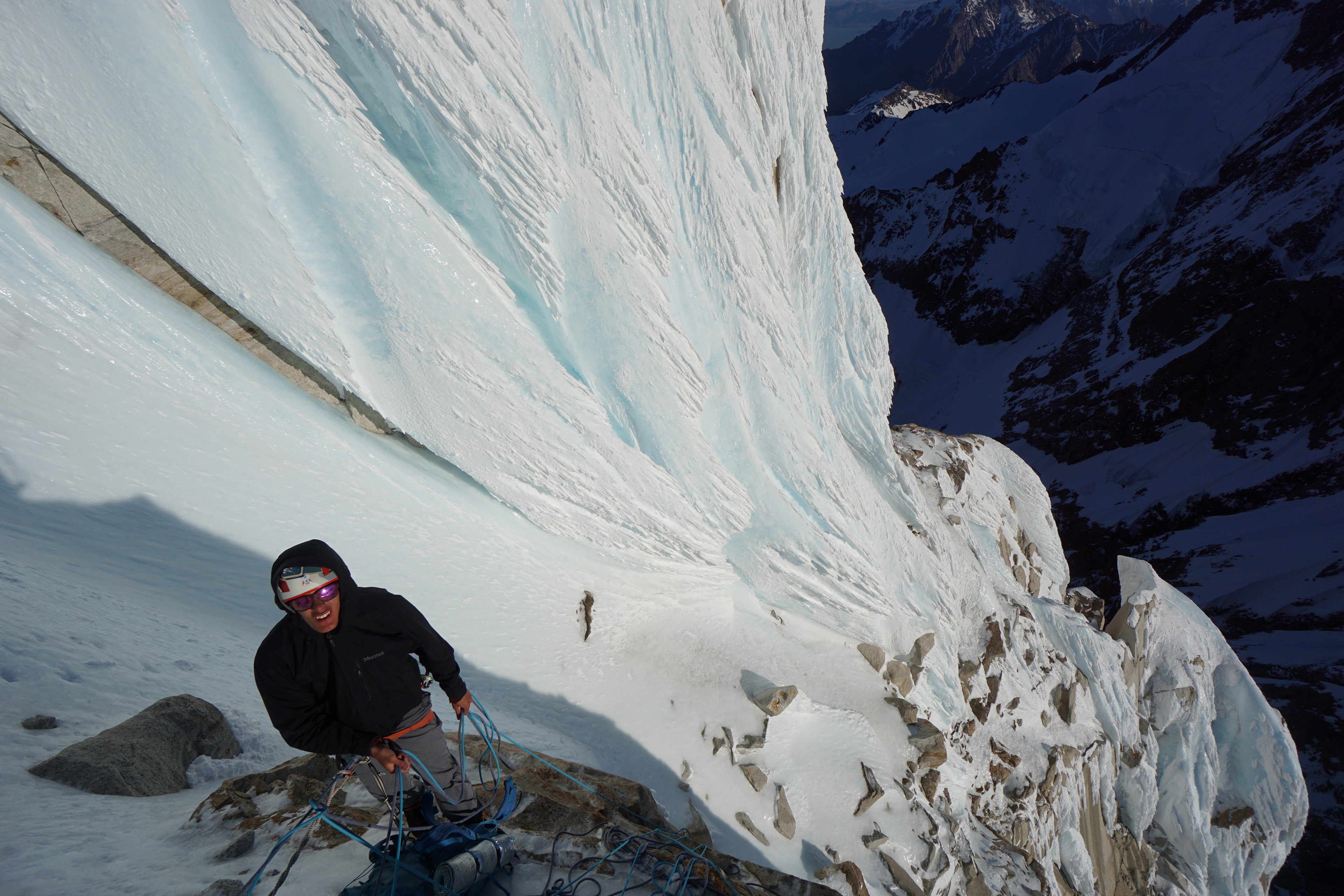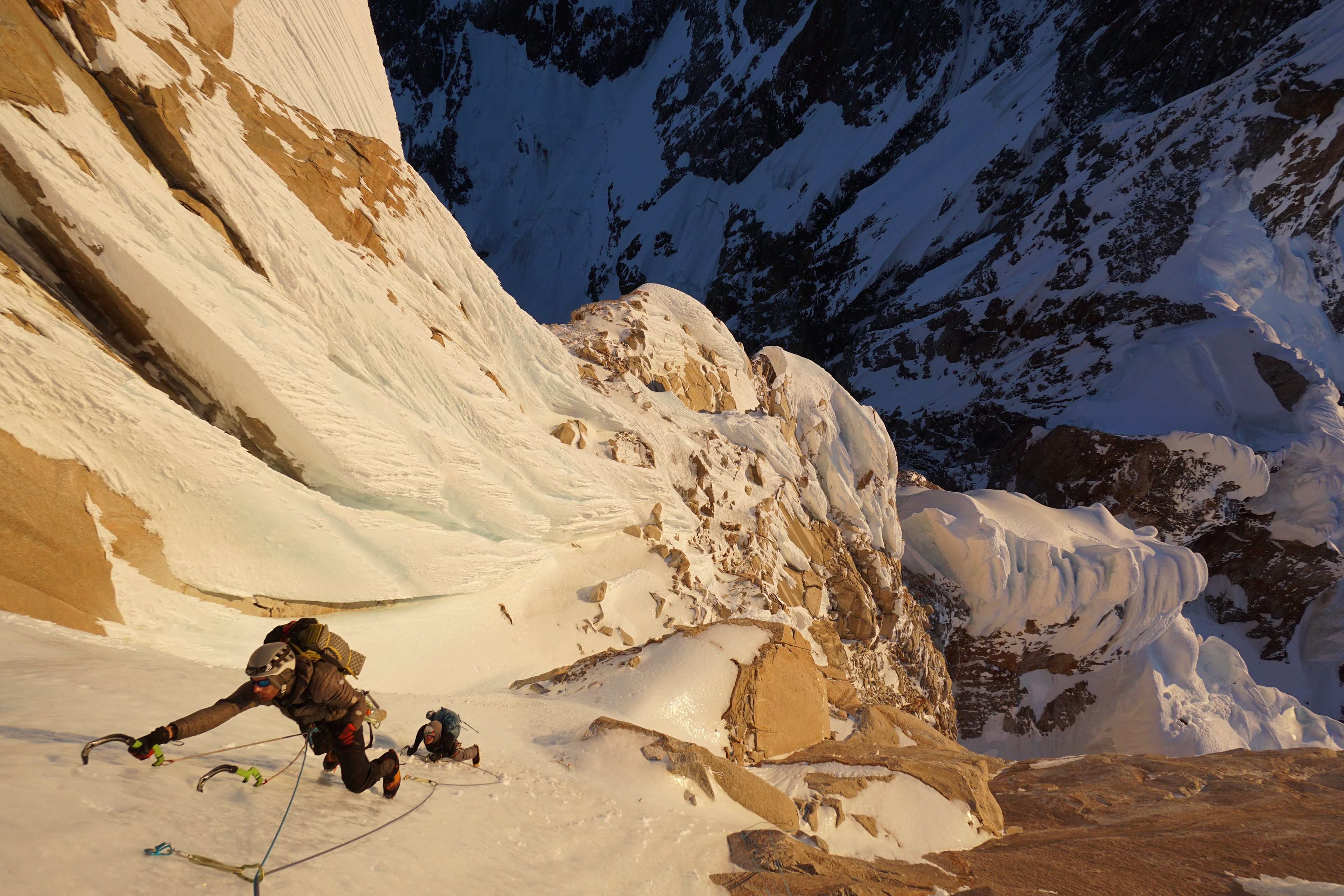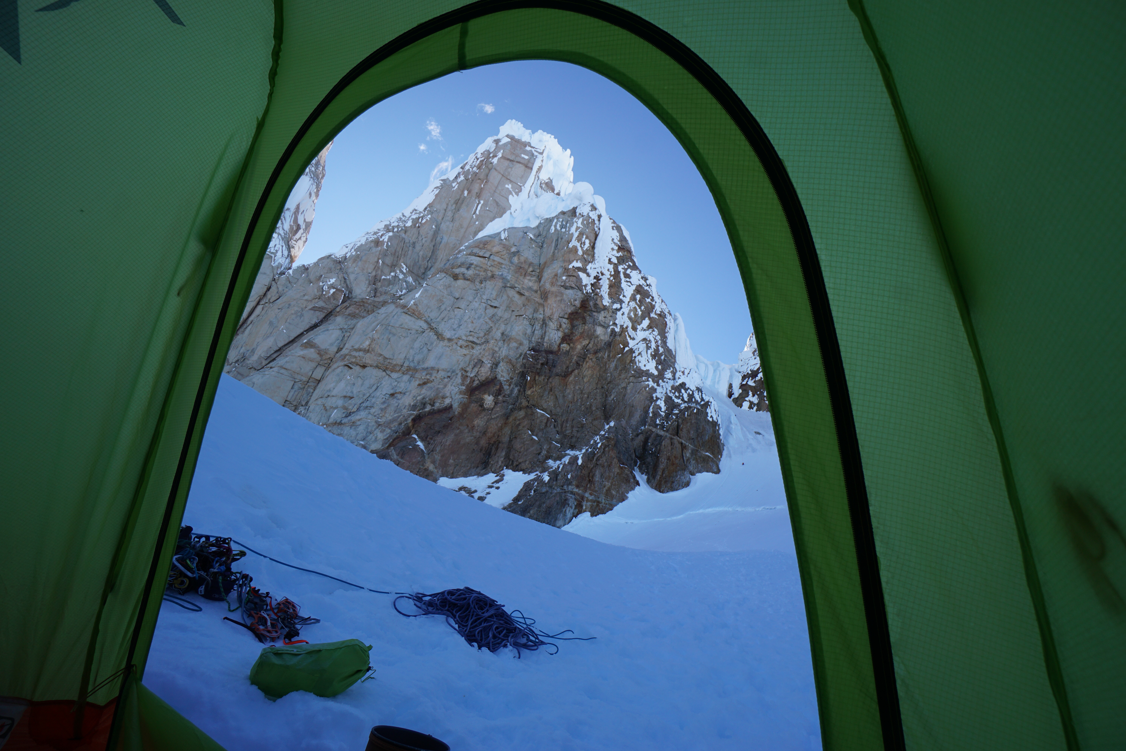 Un largo más nos dejó en la base del headwall, ahora sí, cada paso requiere un gran esfuerzo, venimos escalando hace muchas horas y los dos largos que nos separan de un posible lugar para dormir son muy verticales y exigentes. Comienza Luis, el primer largo lo pasa bien y arma una reunión un poco más arriba de la mitad del headwall. Con Ema lo seguimos, los brazos se empiezan a acalambrar, trato de respirar profundo y de alguna forma, llevar el aire directamente a los antebrazos. Nos juntamos en la reunión, falta muy poco para salir de esta parte tan vertical, es tarde y estamos cansados, con gran esfuerzo salimos arriba, encontramos la cuerda y el escaper de Collin Haley. Nos volvemos a asombrar de que haya hecho todo eso solo y en invierno, traveseamos a la izquierda, debajo del primer hongo y encontramos un lugar para dormir. Ya son más de las 22:00, escalamos unas 18/19 horas, todavía tenemos que hacer la plataforma para armar la carpa, derretir nieve, comer y de una vez por todas, poder dormir.