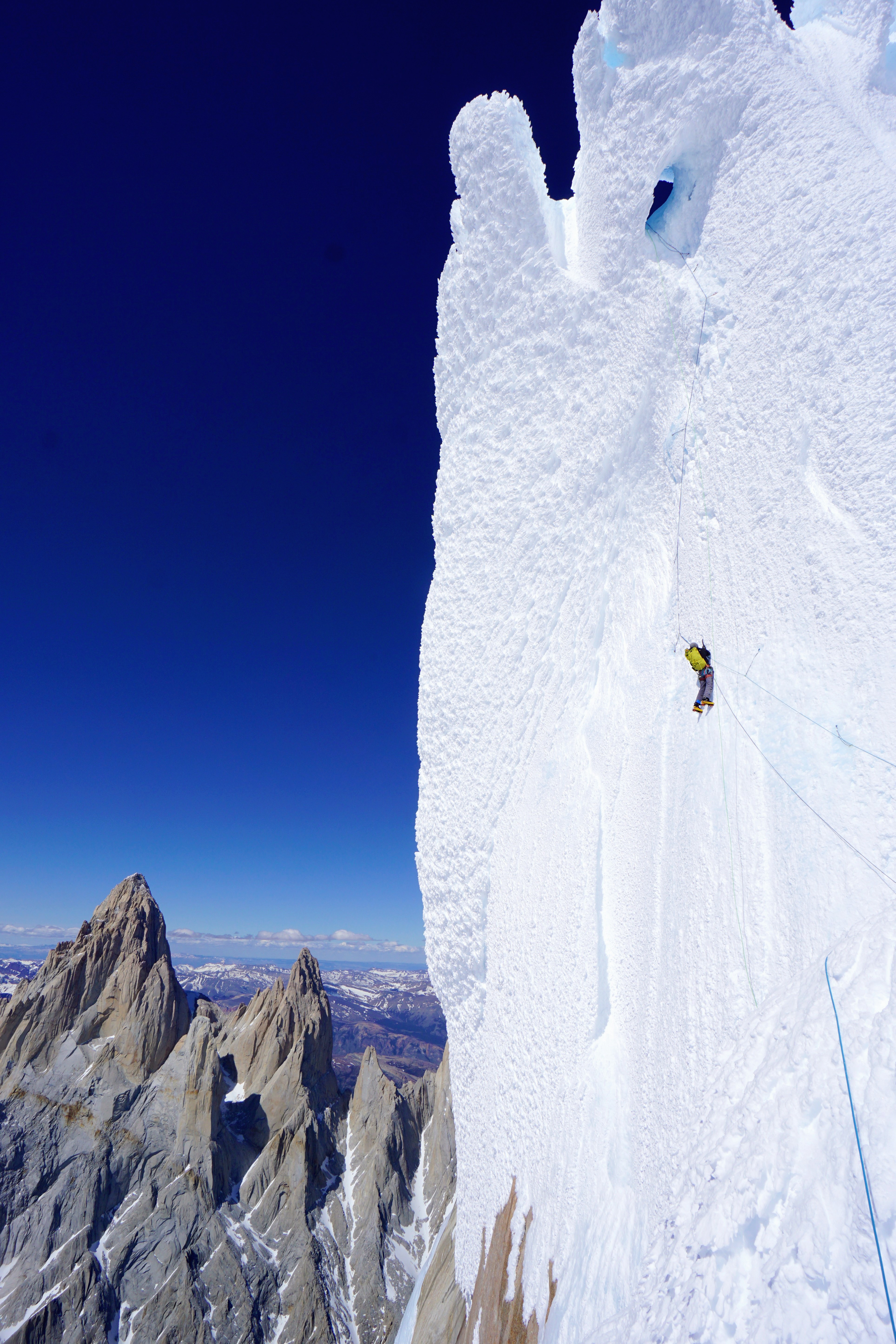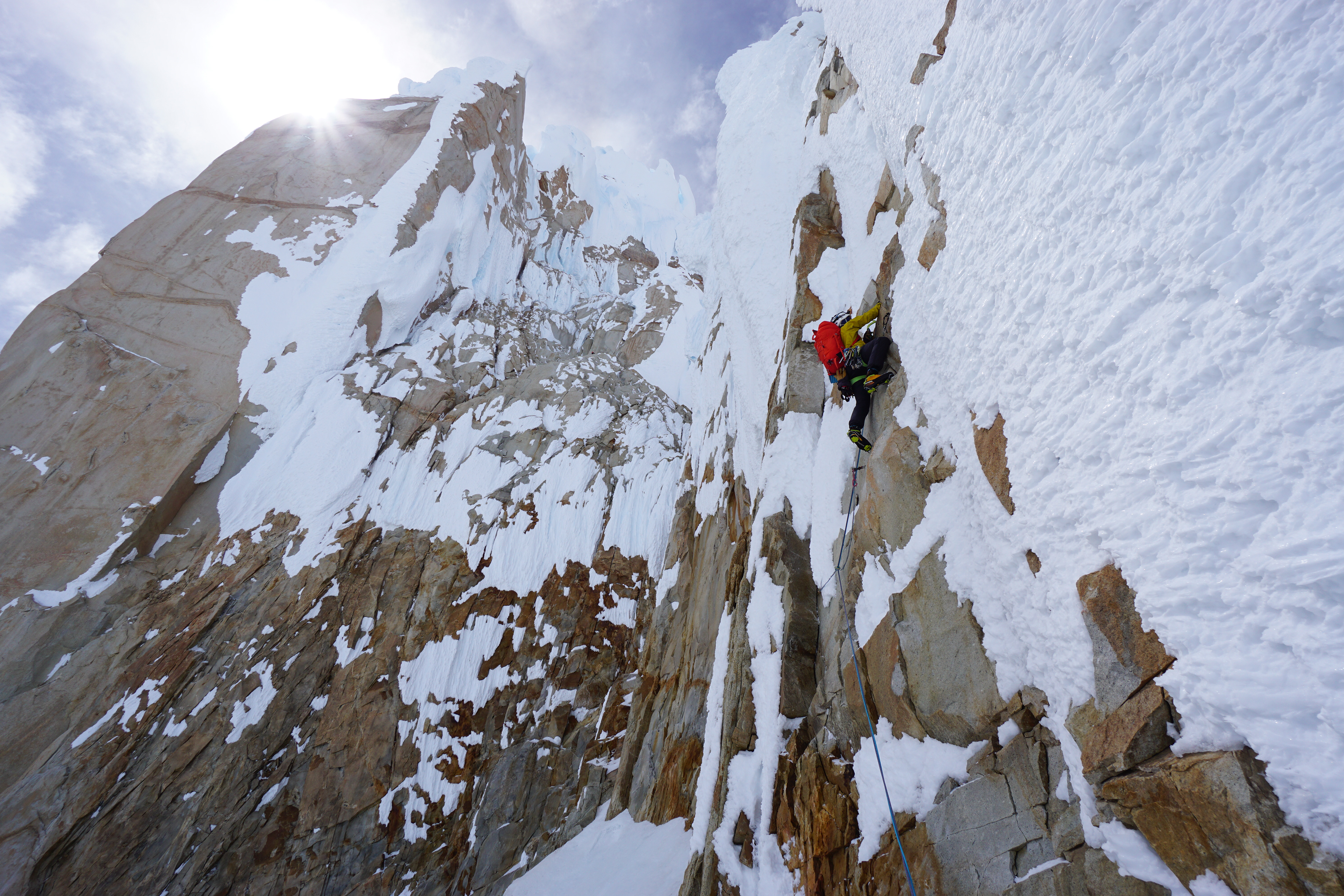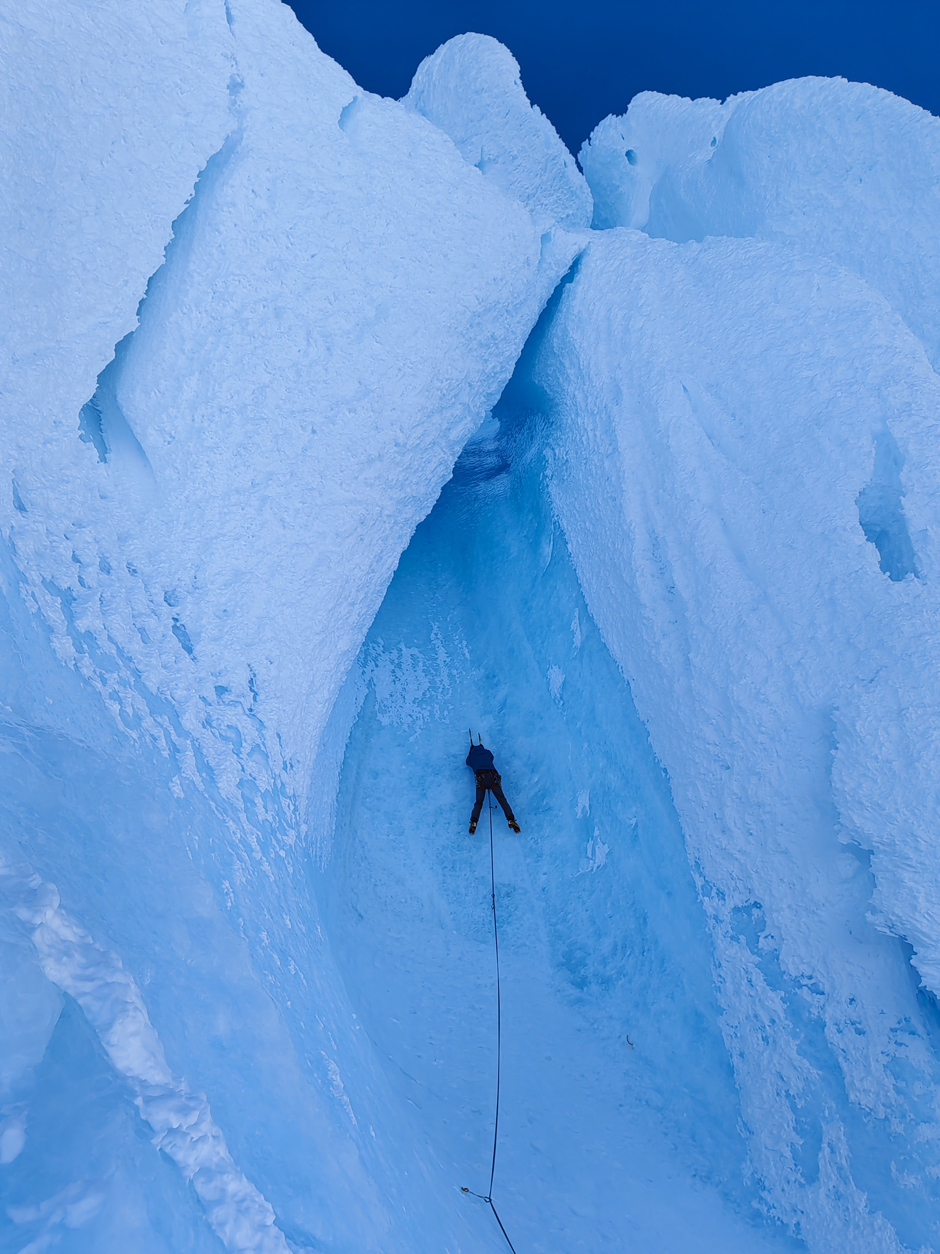 Primero salió Ema y luego Luis y yo. El largo final era mucho más duro de lo que se veía, la escarcha es algo muy particular y difícil de escalar, lleva mucho tiempo y esfuerzo y por sobre todo, las protecciones no siempre resisten. Nos juntamos los tres en la reunión y de ahí solo quedaban unos treinta metros aplomados a la cumbre; los hace Ema y desde ahí nos asegura.