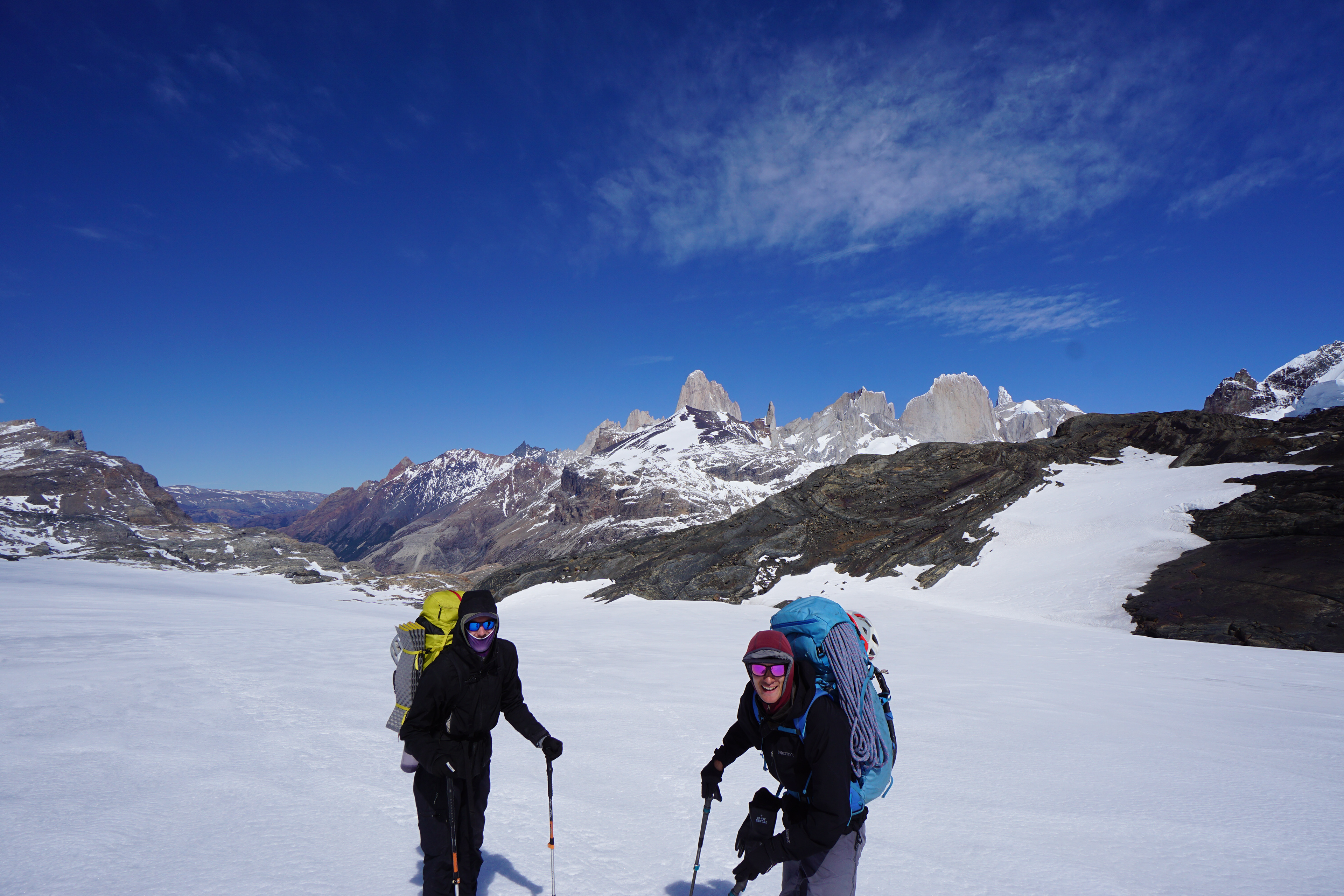 Con las mochilas listas, empezamos a caminar desde el puente del Eléctrico; el objetivo es llegar al paso Marconi y ahí pasar nuestra primera noche. Atravesamos el bosque para entrar al valle, mantenemos un buen ritmo, vamos disfrutando de vistas increíbles. El terreno empieza a transformarse: nos adentramos en morrenas y luego llegamos al glaciar que baja del paso Marconi. Nos cuesta un poco encontrar la pasada al principio del glaciar, pero después de un rato pasamos, seguimos subiendo, cambiamos las zapas de aproximación por las botas y un poco más adelante entran a la cancha las raquetas. Llegando al paso, vemos un desprendimiento gigante de una banda de seracs que domina la parte izquierda de este valle, esto nos recuerda dónde estamos y que tenemos que estar muy atentos; las montañas y sus glaciares están activas y en movimiento. Después de unas 8 horas llegamos al paso Marconi, buscamos un lugar para armar la carpa y descansar, nos deleitamos con las vistas al campo de hielo y su inmensidad.
