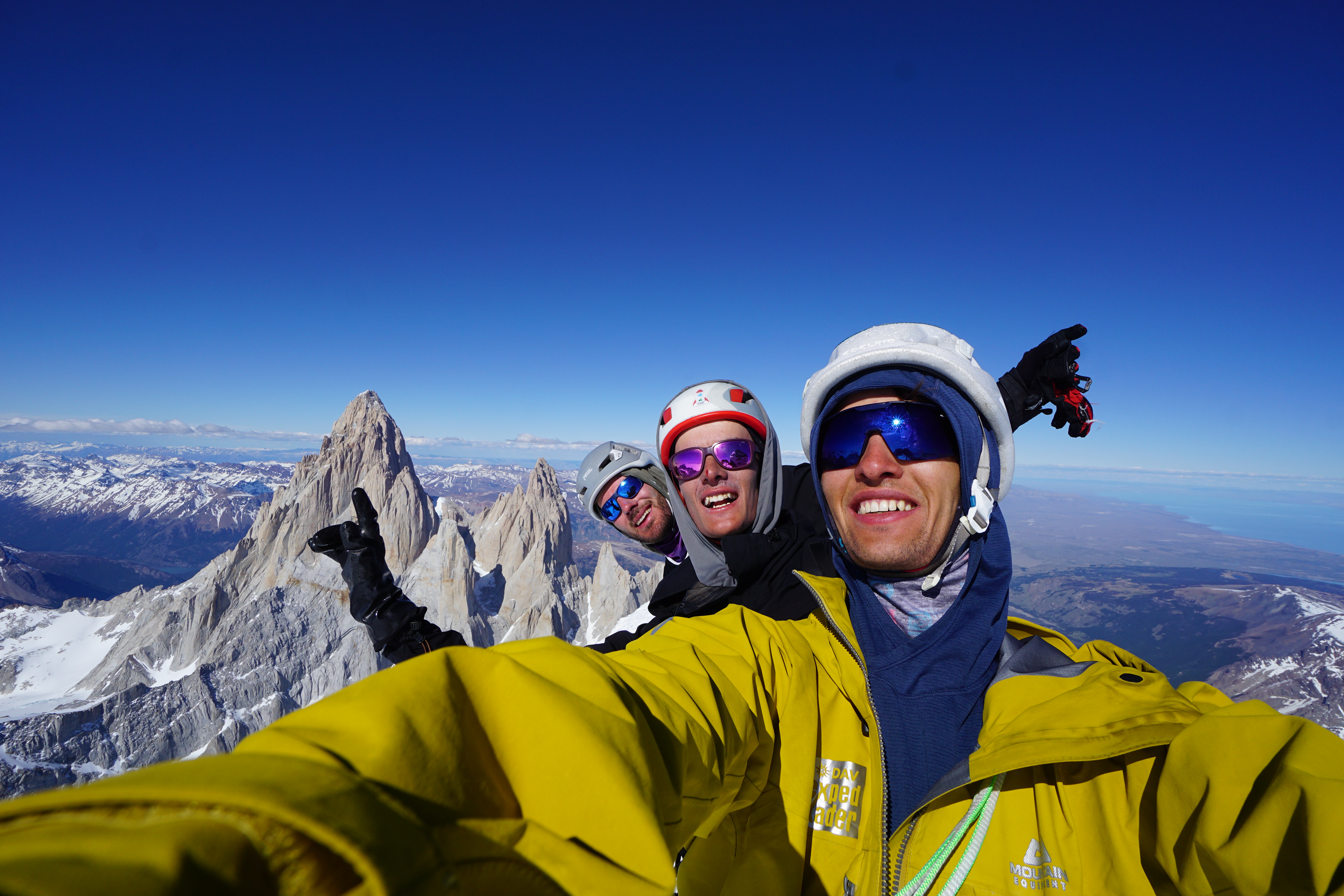 Son las cinco de la tarde y estamos arriba: puedo ver todas las agujas del cordón del Fitz, todos los hongos desde el mini Torre hasta las Adelas, veo el lago Viedma y al darme vuelta, la inmensidad del campo de hielo, no sé qué hacer, me arrodillo, me vuelvo a parar, abrazo a los chicos, reconozco la emoción en la voz del Ema.