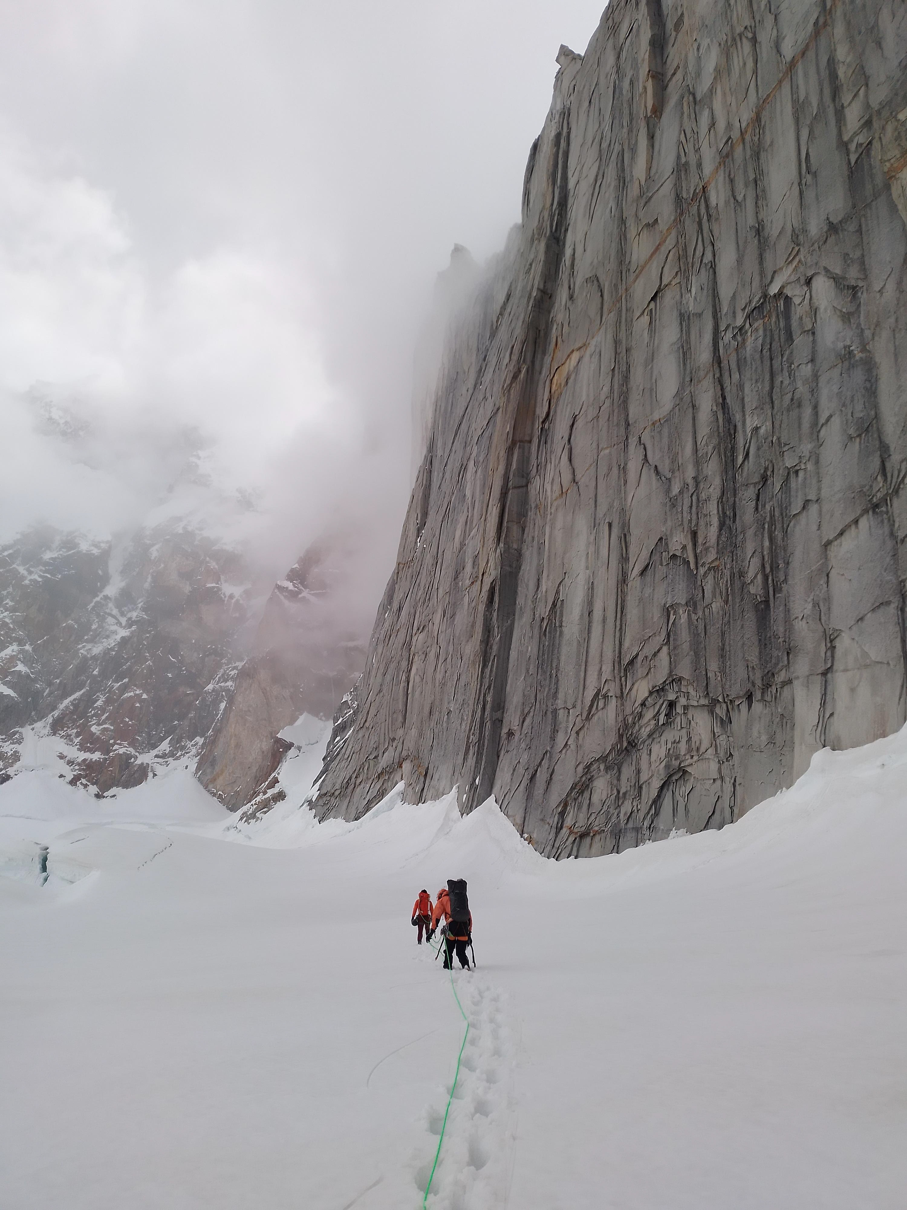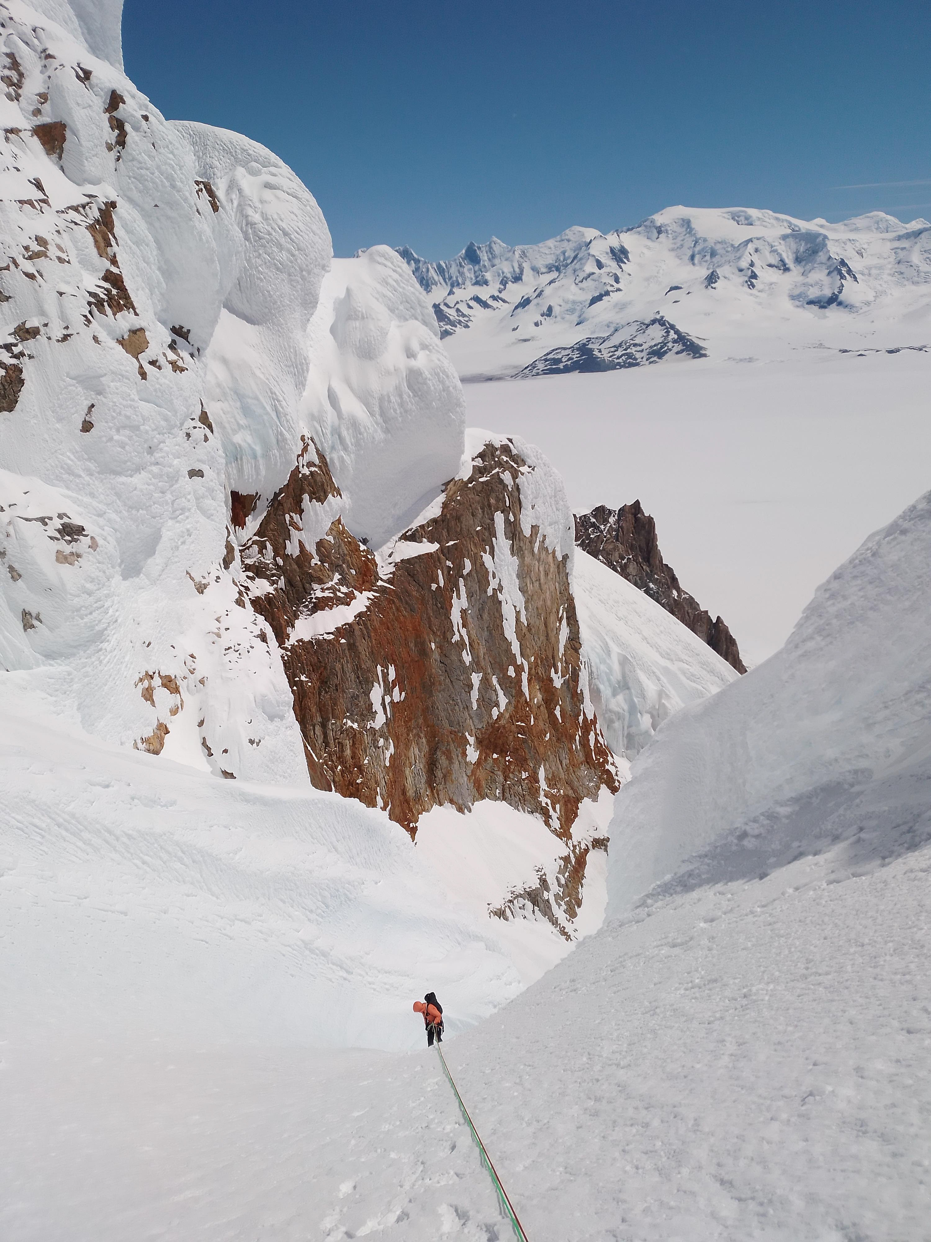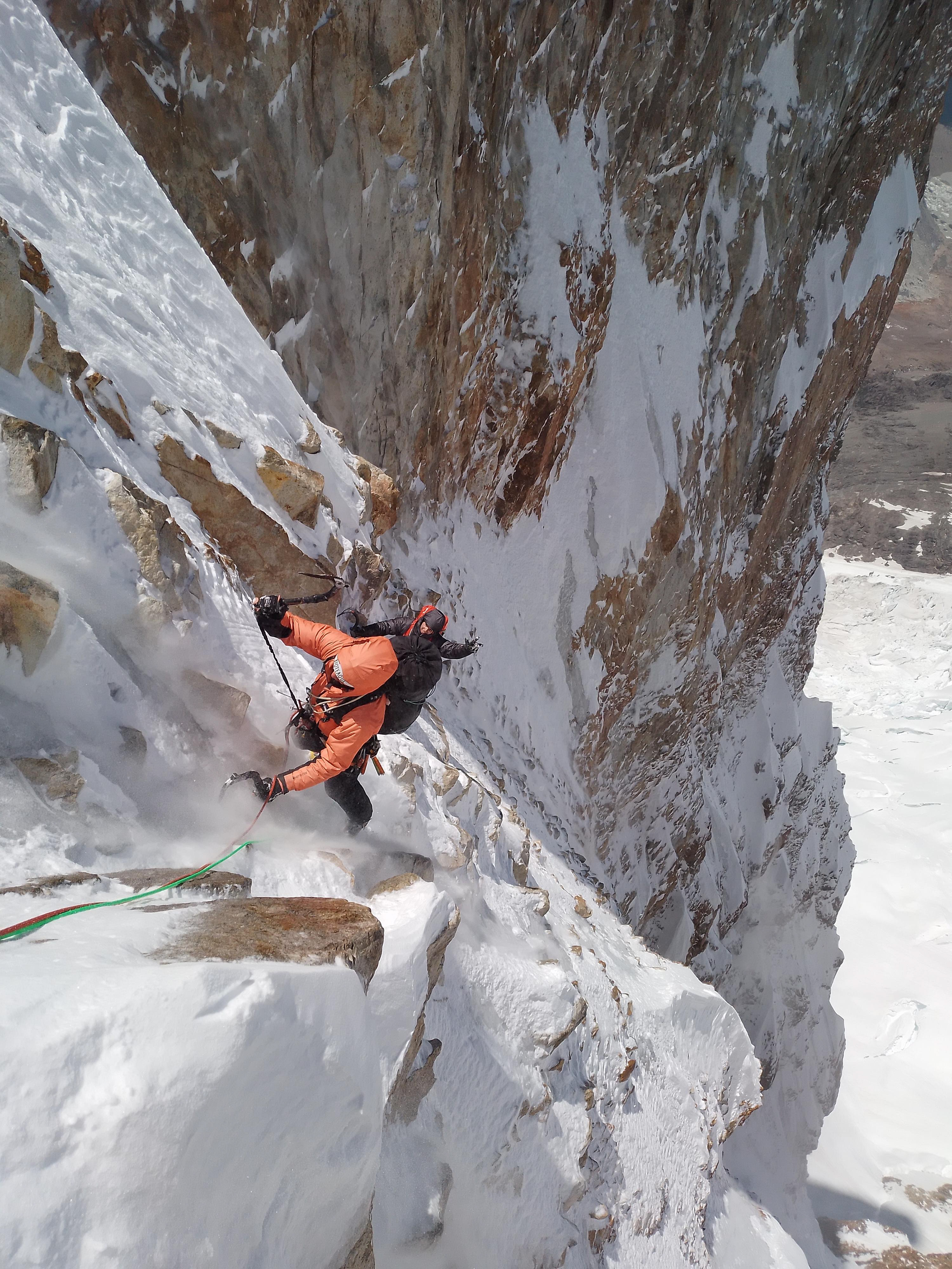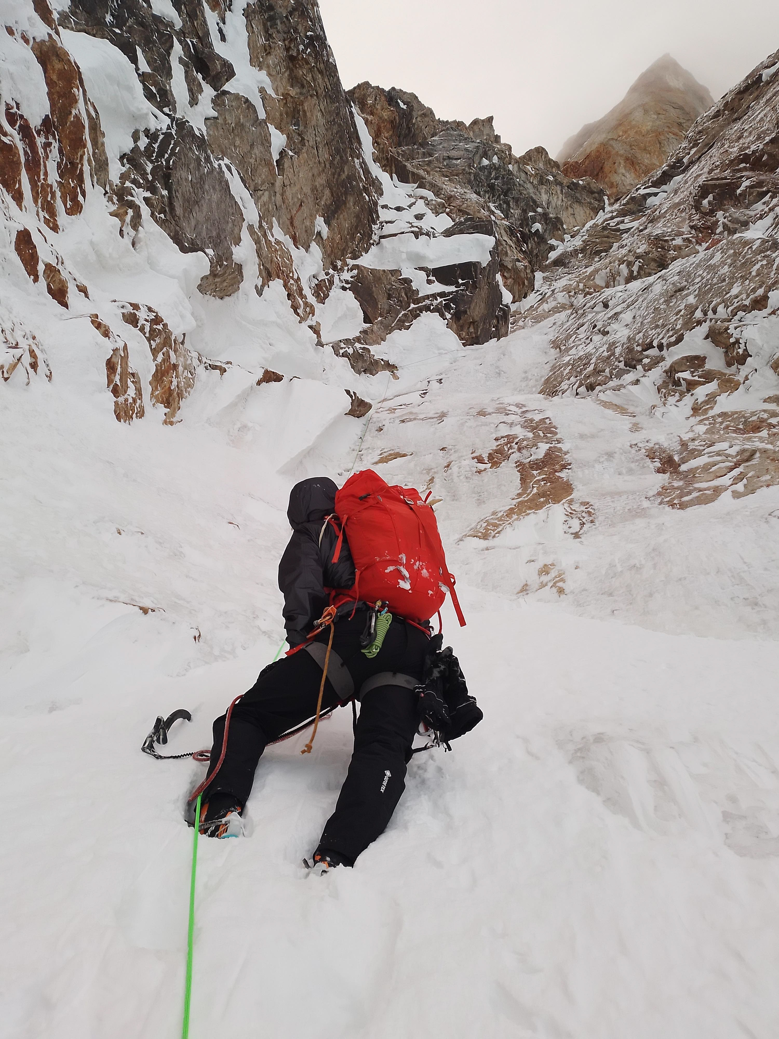Las nubes volvieron a entrar a la pared y escalábamos, mientras pequeños copos caían armoniosamente. Seguimos avanzando por un canal con buen hielo, pero éste nos estaba llevando a un lugar sin salida; en el siguiente largo Tom (Odell) hizo algunos intentos pero no le convencía ir por la derecha, que era la dirección que debíamos tomar, así que regresó hasta la reunión y decidió travesear a la izquierda. Ahí se dio cuenta que estábamos en la línea del serac y que estábamos fuera de la vía, un rapel en diagonal nos permitió llegar al segundo canal que habíamos obviado, del que justamente la entrada no era muy evidente. Una vez allí, ya estábamos fuera de la línea del serac y eso nos dejaba más tranquilos.