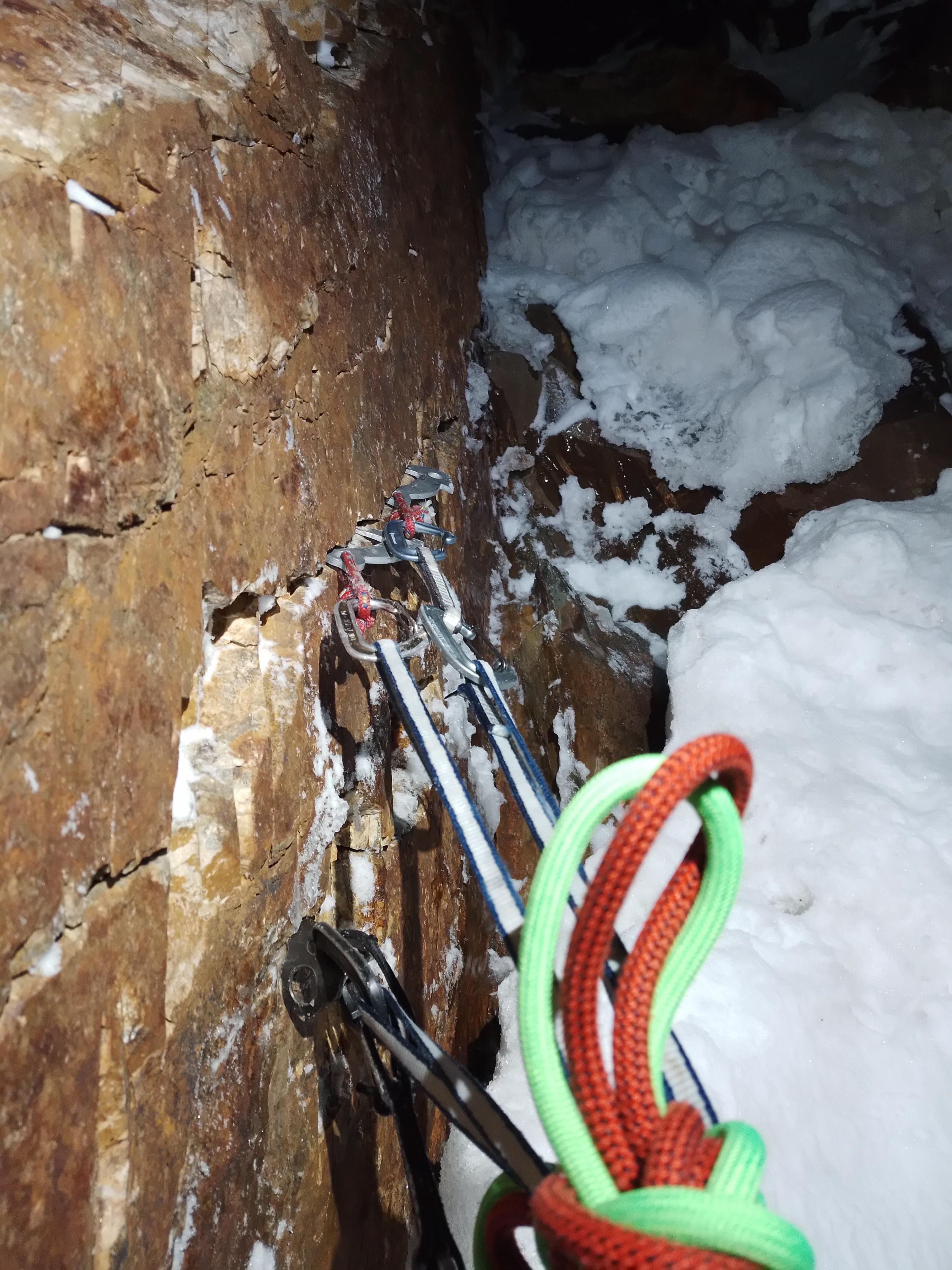 Decidimos cambiar el plan y acceder por ésta. Habíamos salido tarde y llegamos al pie de la vía aproximadamente a las 23:00, pensamos en empezar a escalar en ese momento pero finalmente dormimos hasta las 6:00. Nos levantamos y nos metimos en la pared, pero era justo el peor momento ya que, desde esa hora y hasta el mediodía, es cuando más le da el sol. Escalamos el comienzo y ya empezaba a purgar nieve húmeda con hielo y algunas piedras que pasaban a gran velocidad. Luego de un vuelo de algunos metros, decidimos abandonar un tornillo y bajar de la pared.