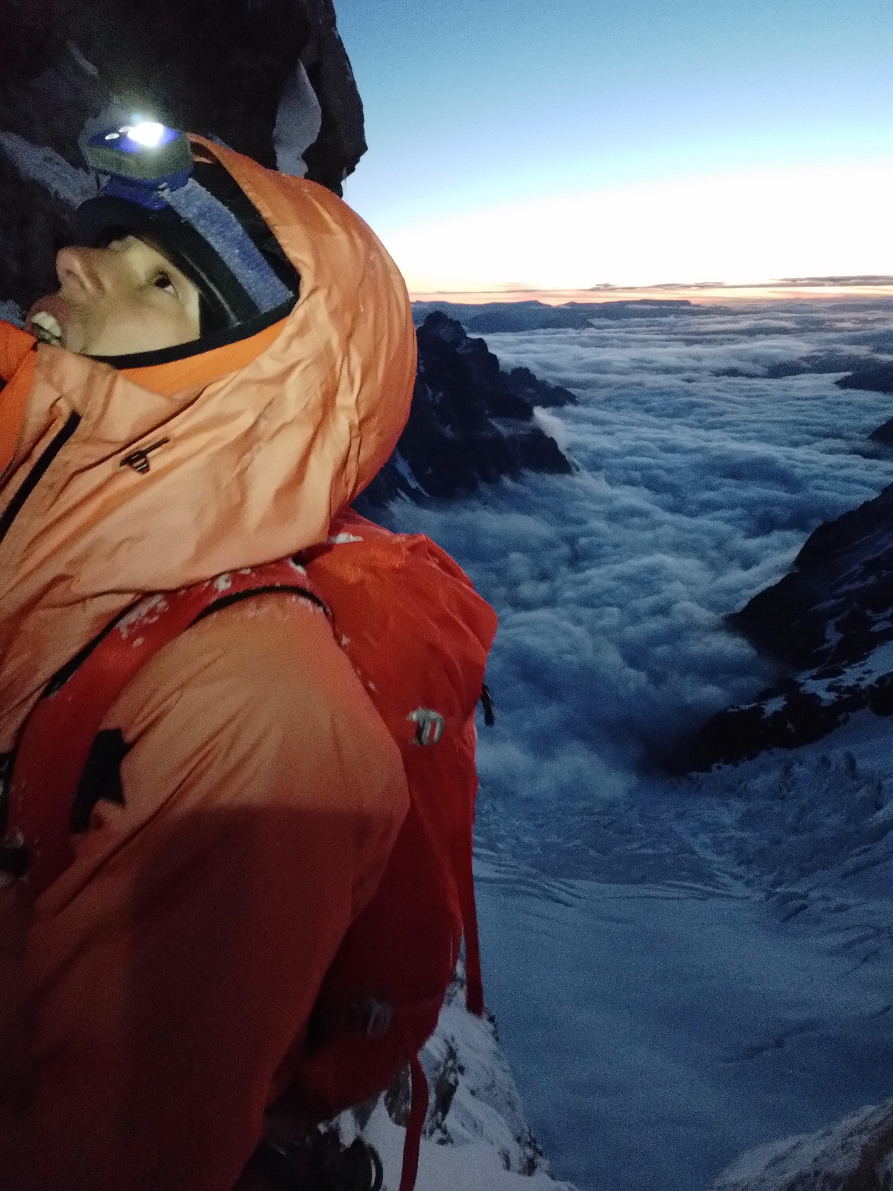 Algunos años más tarde, formamos otra cordada y hablamos de ir a la cara oeste del Torre otra vez, así fue que, revisando fotos, decidimos que acceder por esa línea, Tiempos perdidos, podría ser una opción nuevamente. Entonces, el 4 de diciembre 2024, salimos con la intención de intentar el Cerro Torre. Acceder por Niponino nos daba la posibilidad de intentar Tiempos perdidos o también cruzar por el Col Standhardt, si ésta no se veía viable. Observando la parte baja de la vía con binoculares -ya que la parte alta estaba cubierta por nubes-, decidimos intentarlo. Llegamos a la base de la pared, instalada la carpa nos preparamos para dormir. Sabíamos que al día siguiente había que esperar a que dejara de nevar. A las 16:00 se detuvo y a las 18:00 Pedro (Odell), ya estaba escalando el cono del inicio, luego de cruzar una pequeña rimaya llegamos hasta la primera reunión. Ahí entramos en el primer canal, las condiciones del hielo eran aceptables, con purgas de nieve reciente avanzamos con buen ritmo; pasaron algunas horas escalando este primer canal que por secciones estaba algo escaso de hielo, dificultando la protección. La sección de mixto requirió bastante tiempo, escalando de noche, teniendo que proteger con algún clavo, peker o algún tornillo.