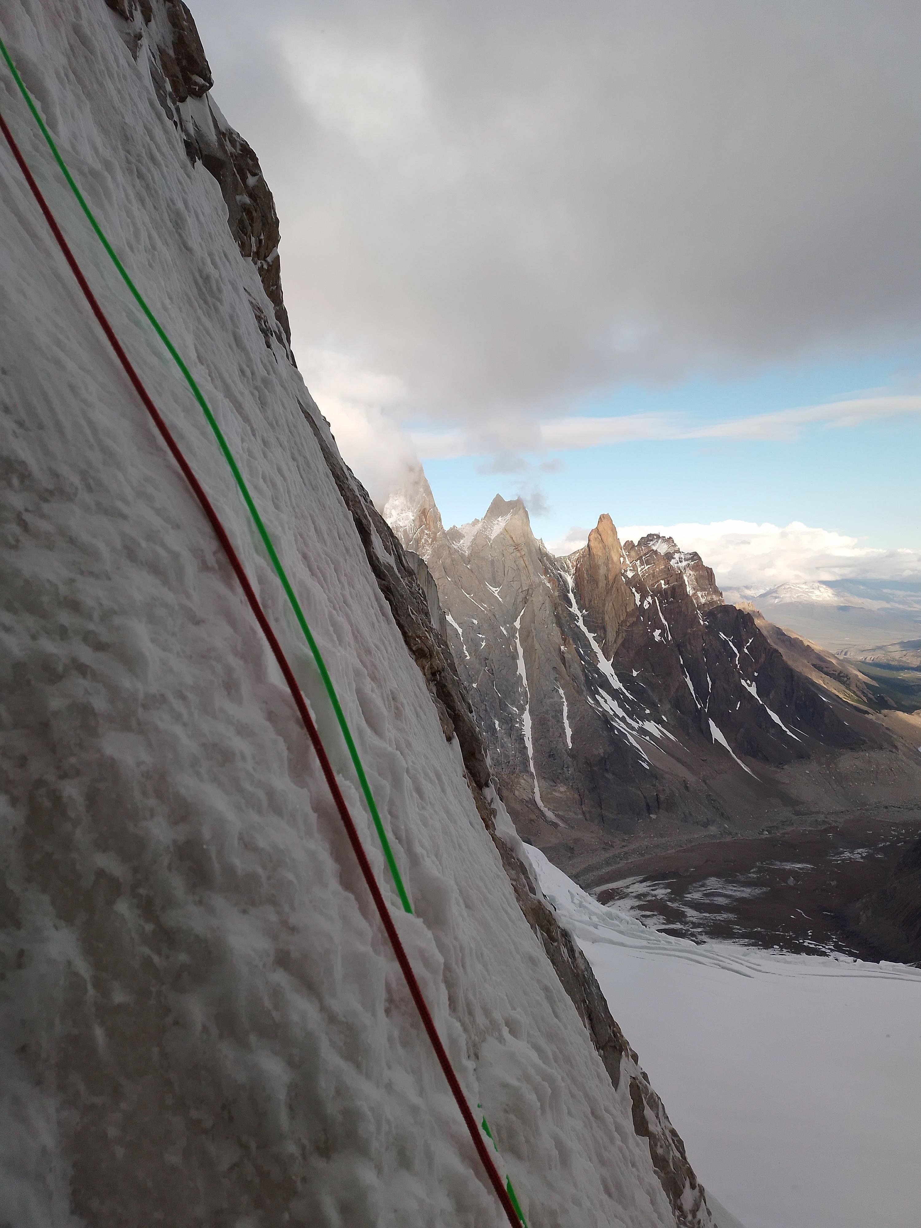 Sin embargo, al avanzar por éste, nos dimos cuenta de que todavía faltaban varios largos, empezamos a sentir el cansancio pero sabíamos que rapelar era bastante complicado y que salir hacia el col era la mejor opción. Avanzamos hasta el último crux de la vía que era un largo técnico de mixto, Pedro escaló de primero llevándonos hacia el último tramo más tumbado hasta el col. Nuestro plan era conectar la Via dei Ragni y seguir por ella hasta la cumbre, ya que habíamos subido con todo para dormir. Debido a que nos llevó más tiempo del que pensamos y que la brecha se cortaba, sin reflexionar mucho, empezamos el descenso hacia el oeste, llegamos hasta el Circo de los Altares esa tarde y al día siguiente caminamos hasta El Chaltén, para compartir un asado con los amigos. En total, la vía nos llevó aproximadamente 20 horas de escalada continua, llegando al col de la Esperanza a las 14:00. Nos pareció una ruta desafiante y con un ambiente espectacular. Con buenas condiciones de hielo toma menos tiempo.