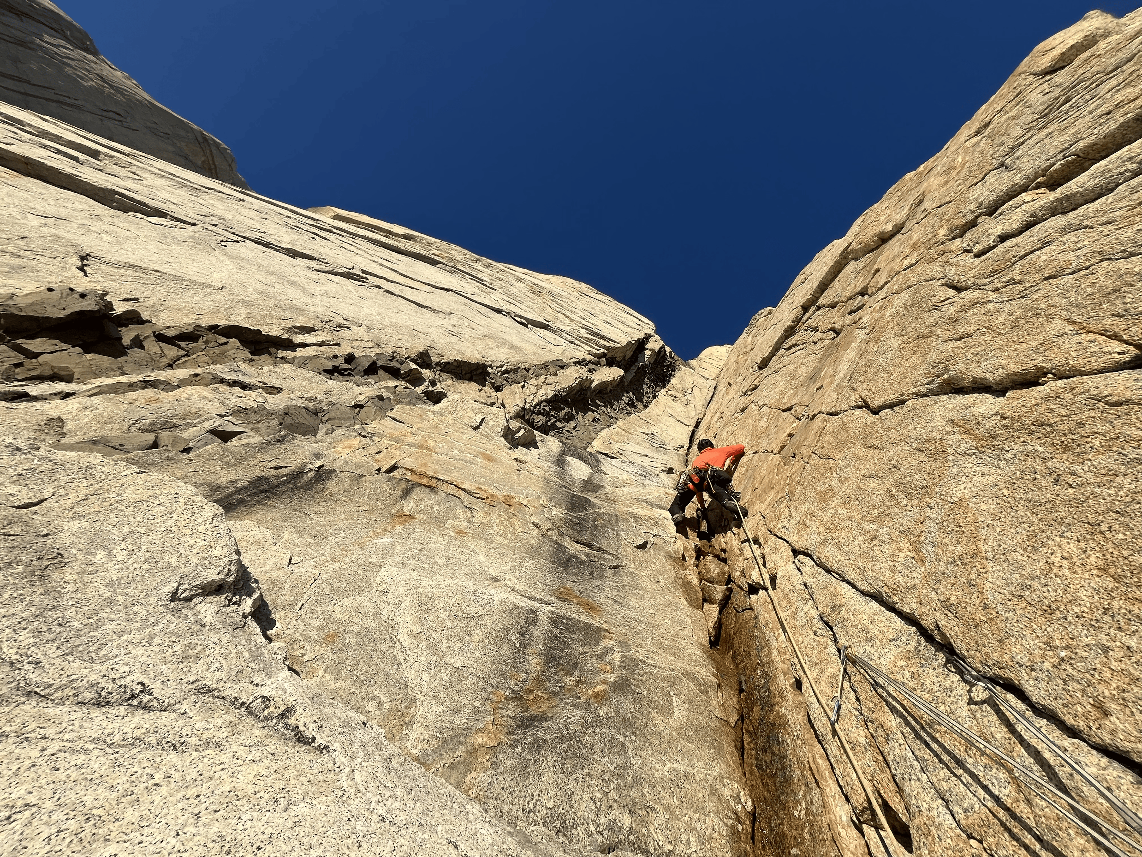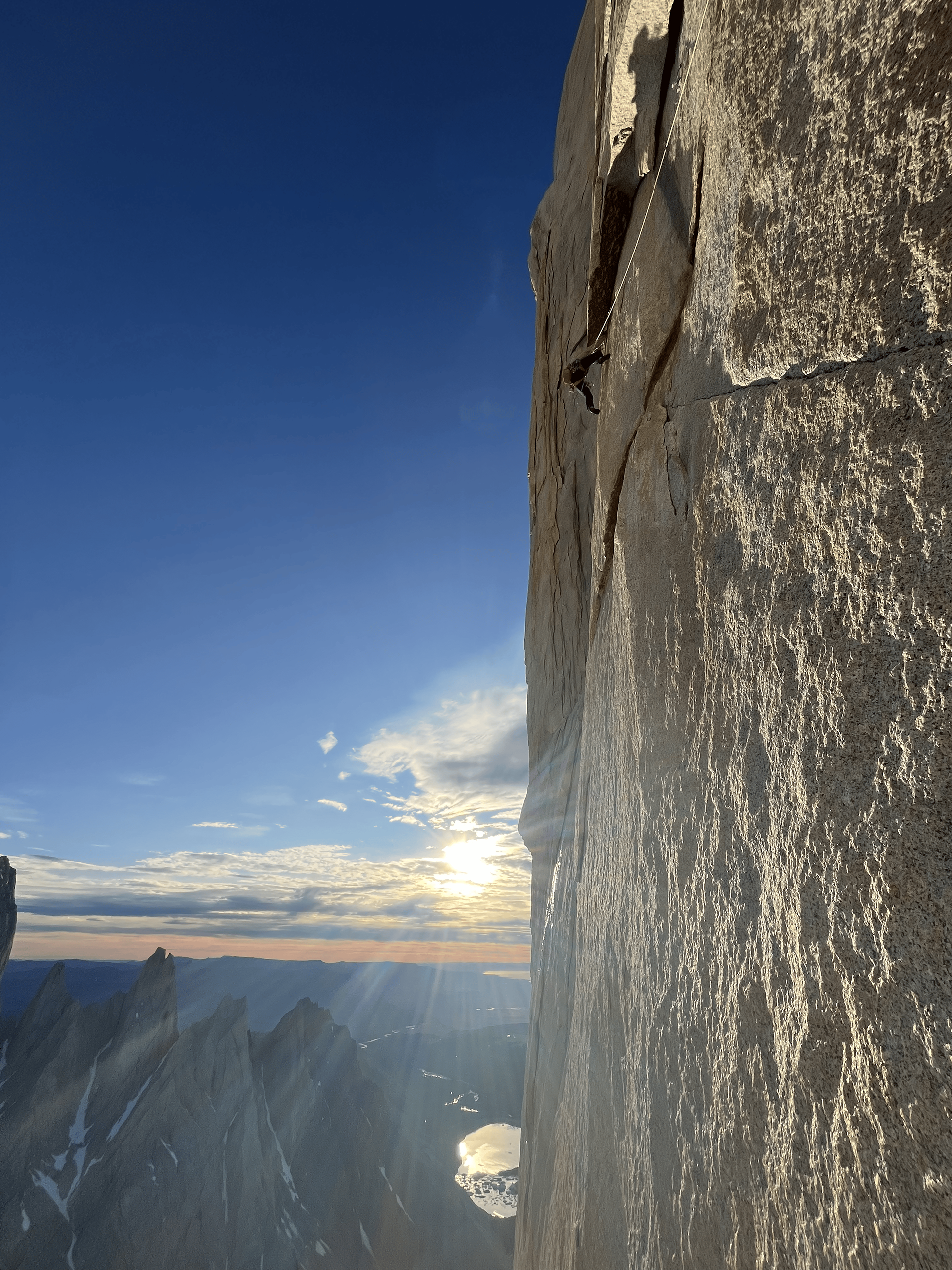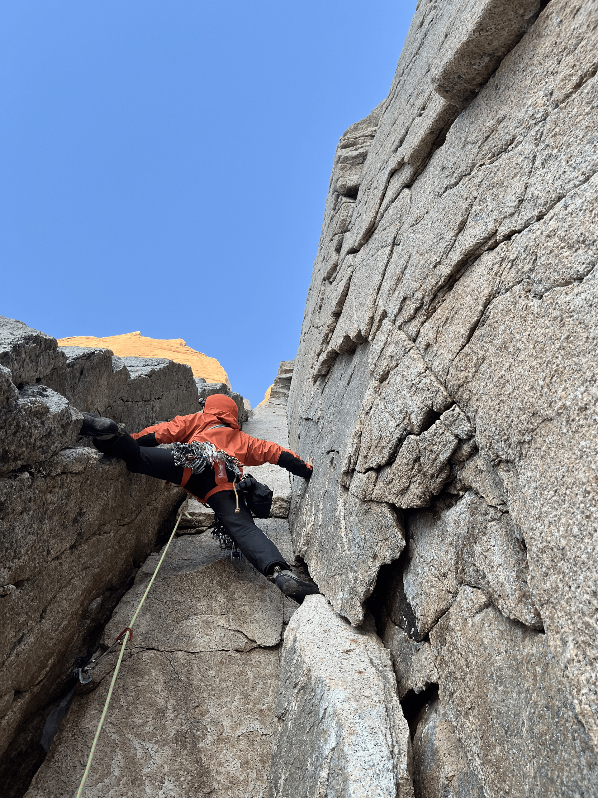 Suena el despertador a la 1:00 del domingo, y tardamos aproximadamente 2 horas en arrancar a escalar, los primeros largos iban bien hasta llegar al 7b, el crux a nivel técnico, pero Bauti logra pasar bastante rápido. Los siguientes largos son todos en travesía lo que hizo que jumarear no sea tan rápido. Desde el final, vimos a los ecuatorianos rapelando la proa, nos dijeron que hicieron cumbre y nos dejaron los rapeles del hongo armados. Para cuando llegamos al gullot que marca el final de la travesía, ya había algo de viento, pero sí o sí tendríamos que hacer los próximos 3 largos para volver a la línea de rapeles. Bauti le pasa la punta a Anthony para que él haga toda la parte del hielo y mixto como lo habíamos planeado. Cuando empieza a escalar ya era pasado el mediodía, hace tres largos y llegamos a la línea de rapel, estábamos justo por debajo del hongo y un poco refugiados del viento, por lo que Anthoy encara el próximo largo.