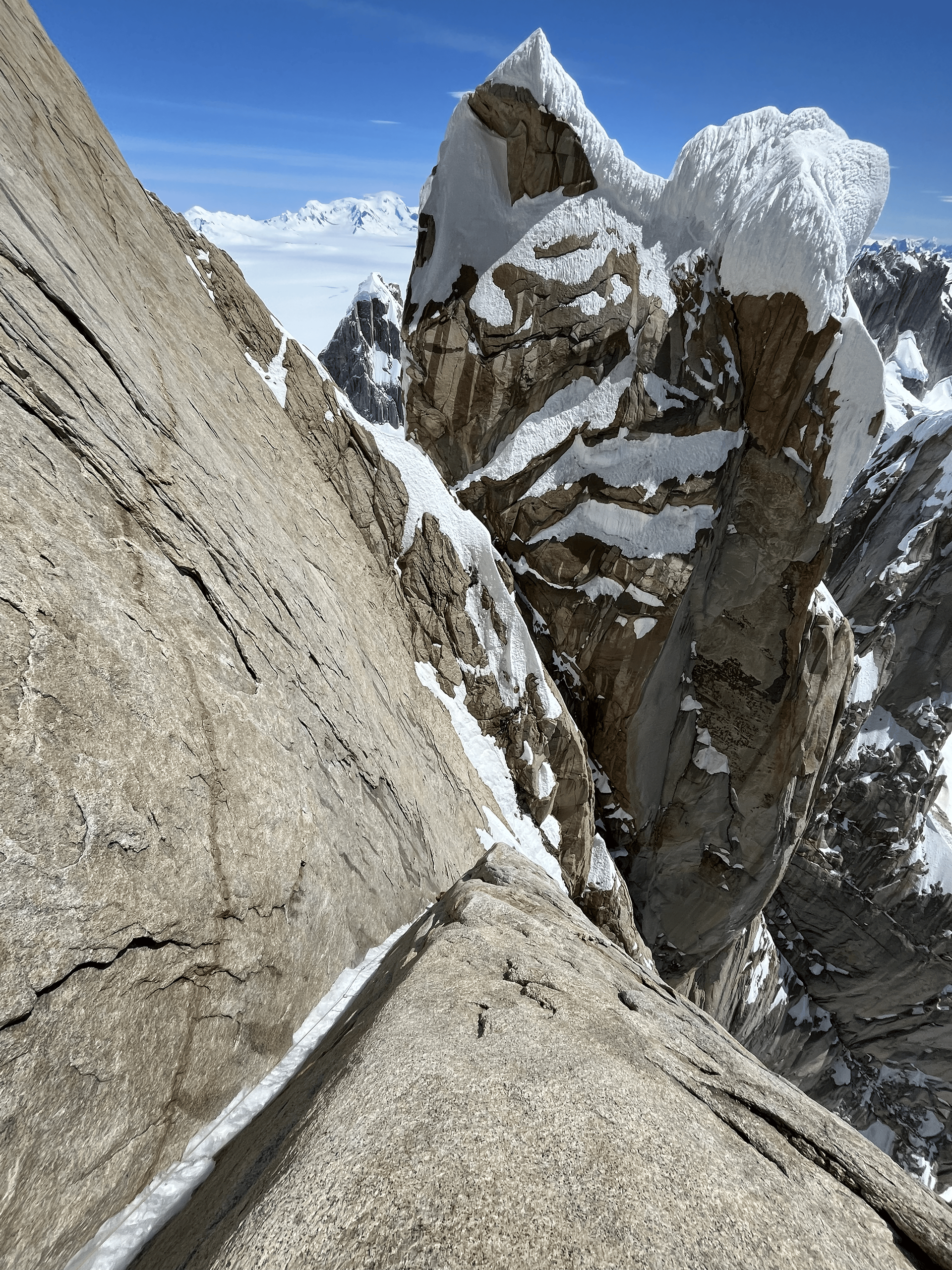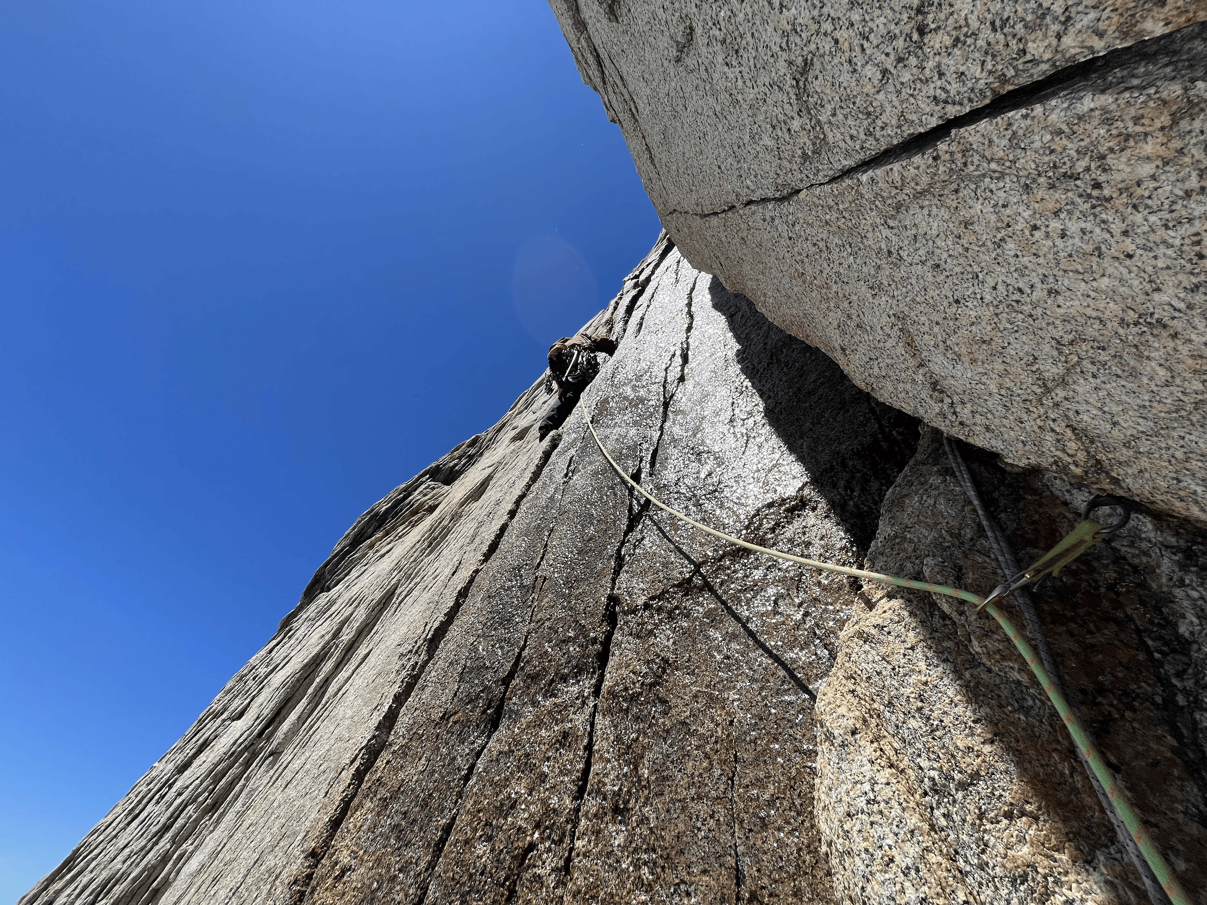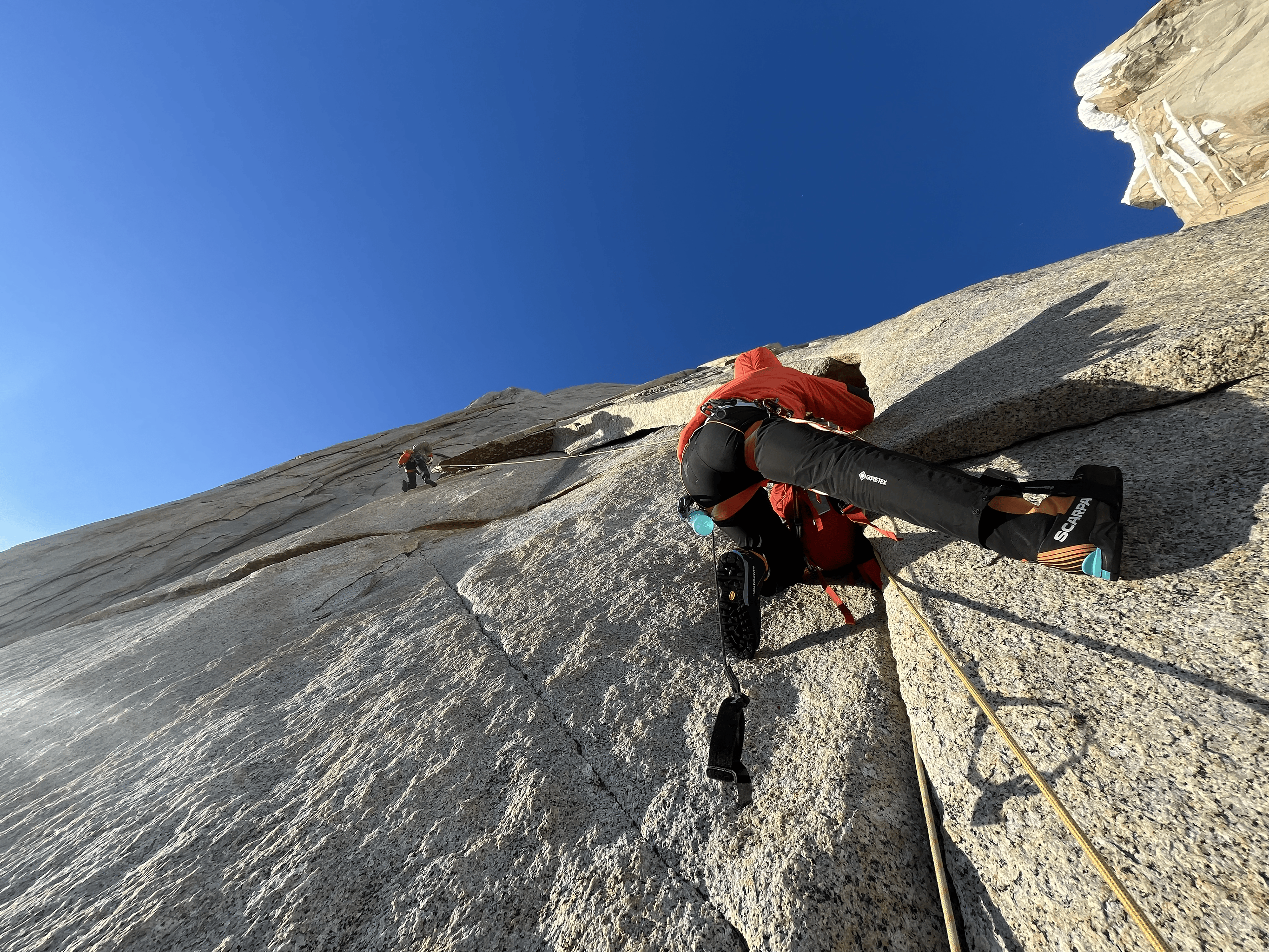 Suena el despertador a la 1:00 del domingo, y tardamos aproximadamente 2 horas en arrancar a escalar, los primeros largos iban bien hasta llegar al 7b, el crux a nivel técnico, pero Bauti logra pasar bastante rápido. Los siguientes largos son todos en travesía lo que hizo que jumarear no sea tan rápido. Desde el final, vimos a los ecuatorianos rapelando la proa, nos dijeron que hicieron cumbre y nos dejaron los rapeles del hongo armados. Para cuando llegamos al gullot que marca el final de la travesía, ya había algo de viento, pero sí o sí tendríamos que hacer los próximos 3 largos para volver a la línea de rapeles. Bauti le pasa la punta a Anthony para que él haga toda la parte del hielo y mixto como lo habíamos planeado. Cuando empieza a escalar ya era pasado el mediodía, hace tres largos y llegamos a la línea de rapel, estábamos justo por debajo del hongo y un poco refugiados del viento, por lo que Anthoy encara el próximo largo.