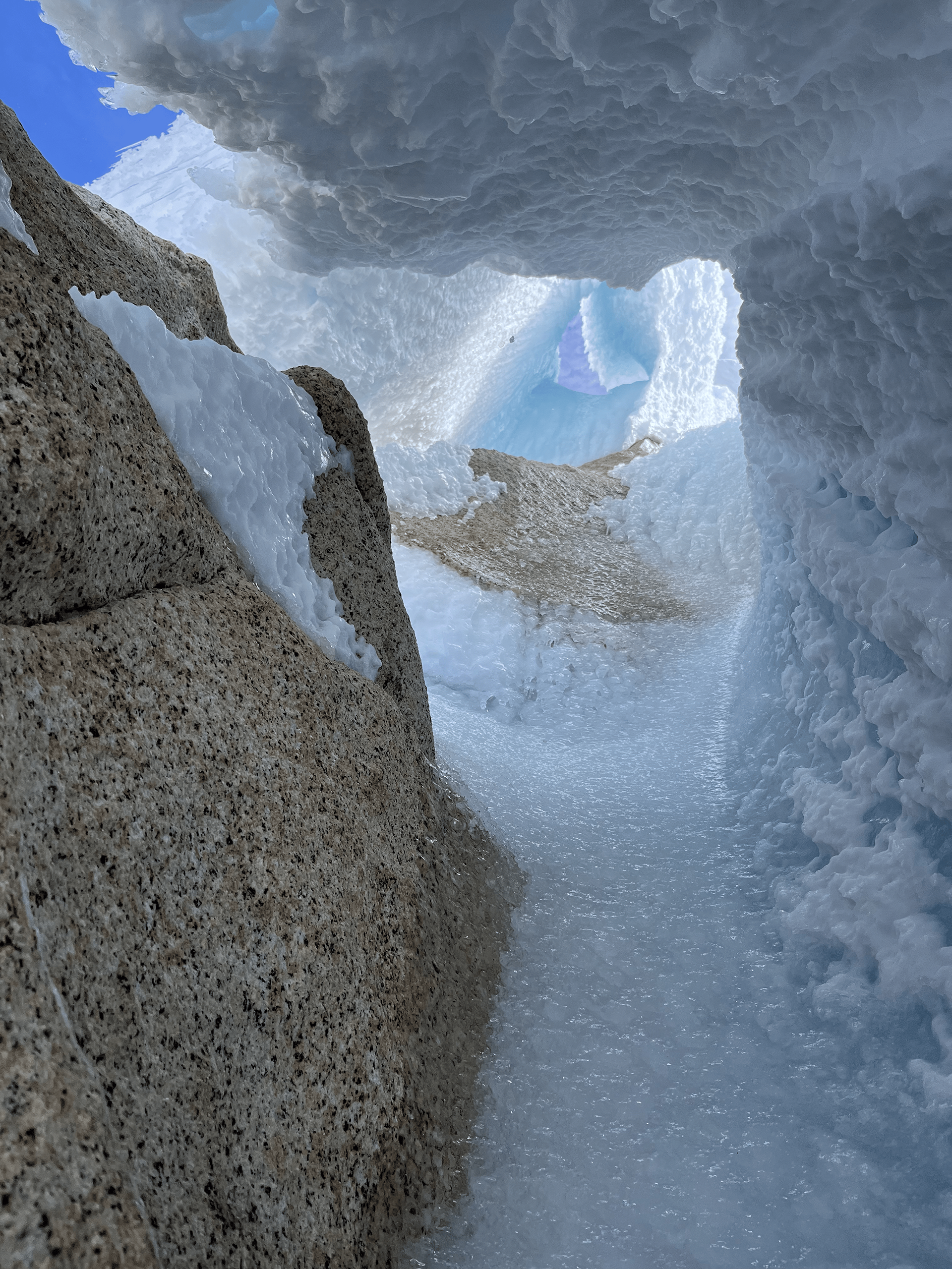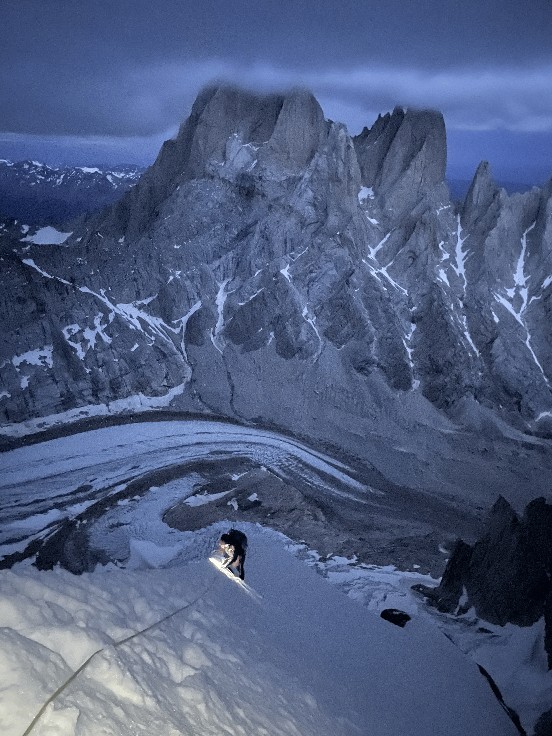 El sábado 28 arrancamos a las 2:00 de Noruegos, media hora antes que los ecuatorianos. Empezamos a escalar de noche y en pocas horas alcanzamos mi punto más alto de otro pegue que había hecho en el invierno. De ahí, hago 3 largos más hasta llegar a la Titanic y le paso la punta a Bauti para que siga de primero. Seguían 3 largos mojados de hasta 6c, los primeros van bien y mientras estoy jumareando el segundo, escucho un grito, cuando miro para arriba veo a Bauti, que estaba escalando el próximo largo, volando en el aire con una laja bastante grande agarrada, me acerco a la pared y siento una parte de la laja pasar justo por detrás de mí. Rápido subo hasta la reunión y Bauti dice que está bien, descansa un rato y vuelve a escalar, el único problema fue que se le rompió un portaequipo del arnés, perdiendo unos guantes, su placa, varias cintas y los stoppers. Después de ese largo, quedaban solo 3 largos de IV° hasta el nevé.