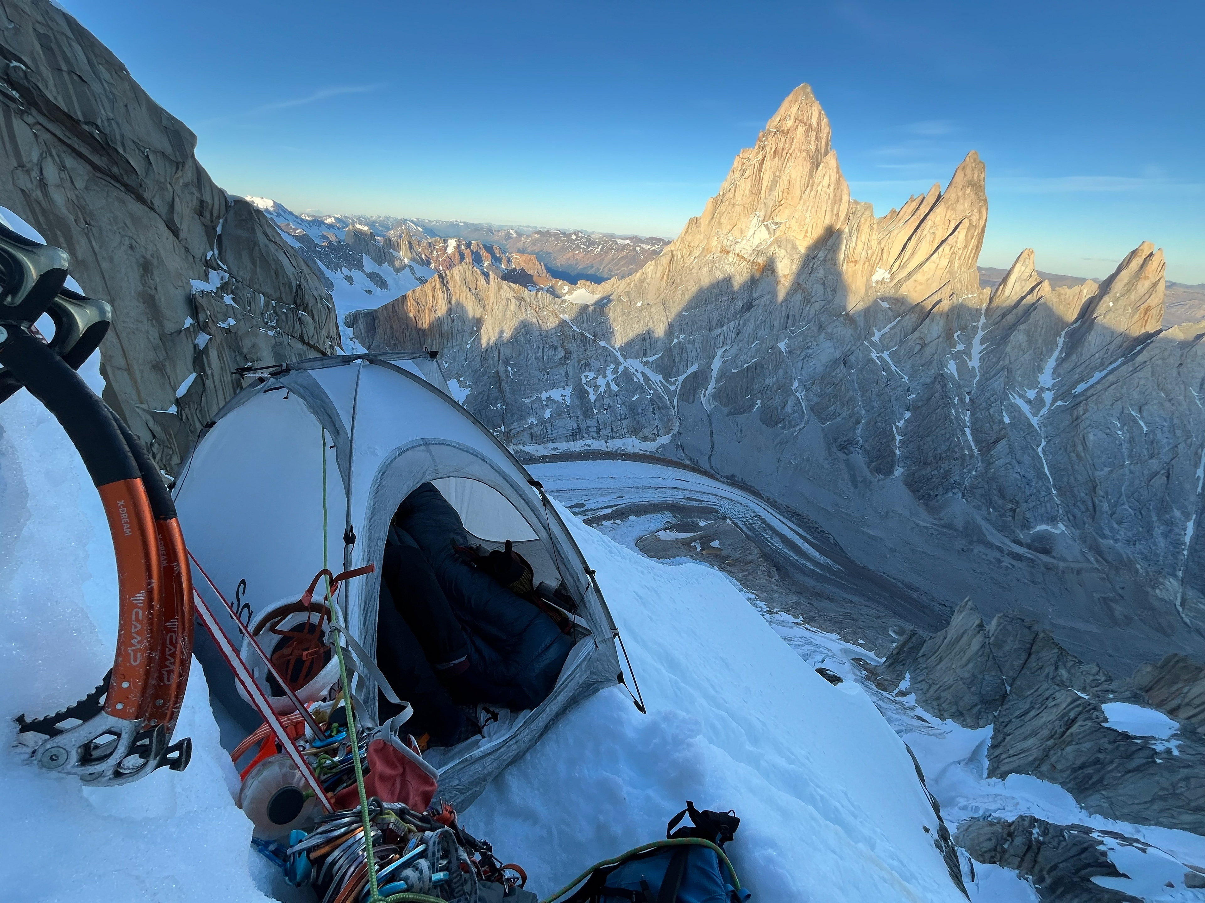 Así comenzaron los rapeles, los primeros fueron bastante fáciles: fui yo adelante, eran todos verticales y de 60 metros. Sin embargo, en el último antes del nevé tuvimos que cortarle como 15 metros a una de nuestras cuerdas. Antes de las 19:00 ya estábamos en la repisa, armamos la carpa, cocinamos y nos hidratamos bien y a las 21:00 nos tiramos a dormir, con el despertador una hora después.